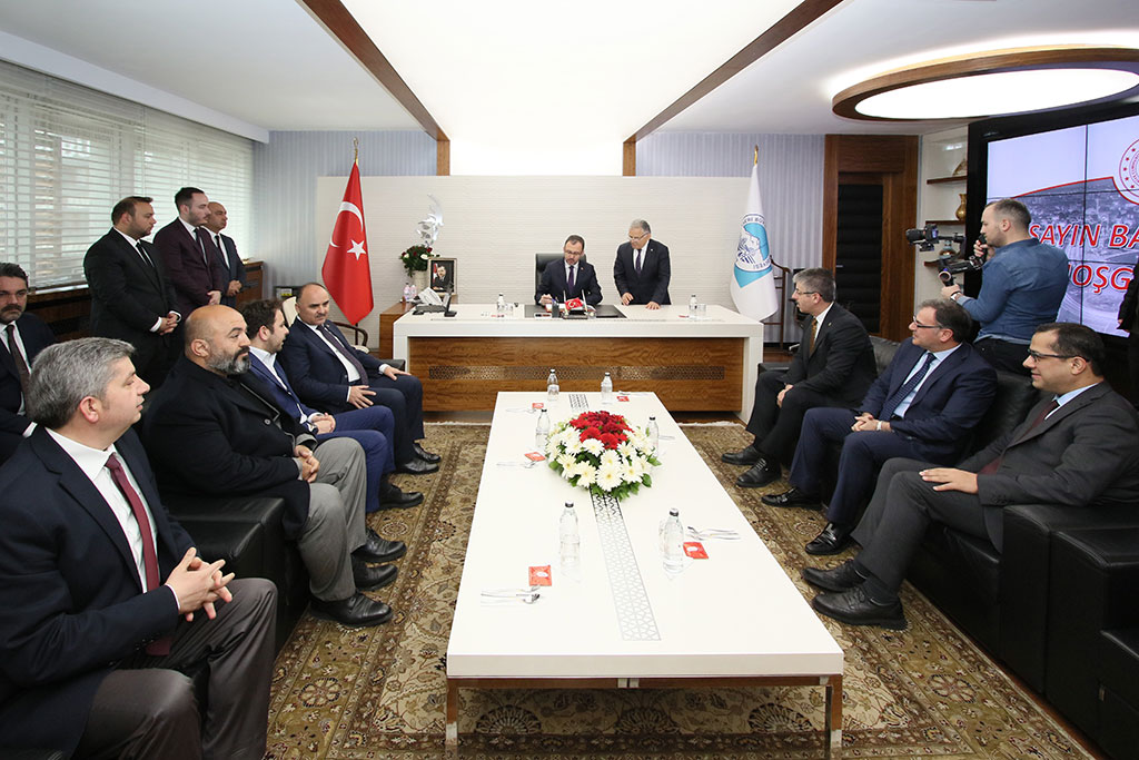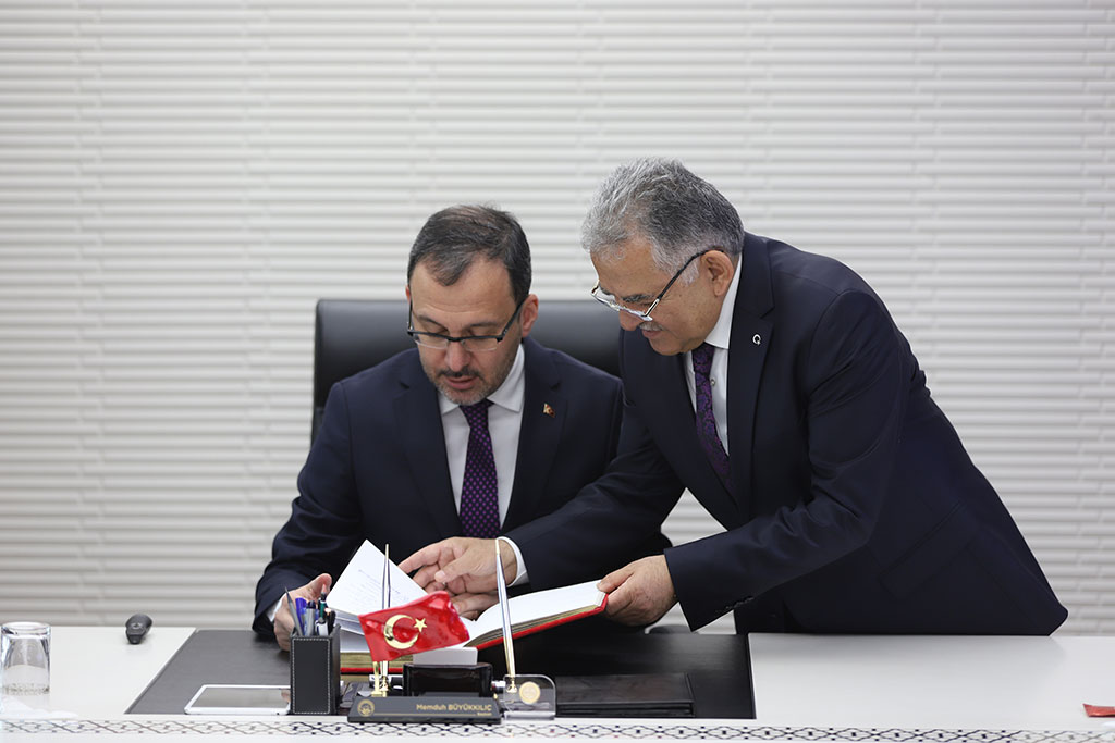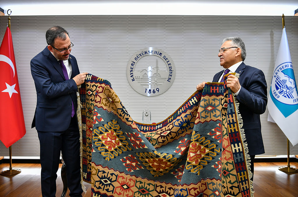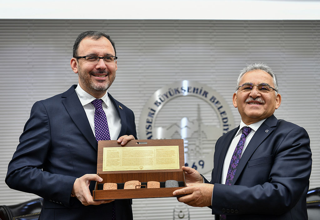 Gençlik ve Spor Bakanı Mehmet Muharrem Kasapoğlu, Büyükşehir Belediye Başkanı Dr. Memduh Büyükkılıç’ı ziyaret etti. Ziyarette Erciyes’e yapılacak olan Yüksek İrtifa Kamp Merkezi için Gençlik ve Spor Bakanlığı’nın destek vereceği vurgulandı. Büyükşehir Belediye Başkanı Dr. Memduh Büyükkılıç, Gençlik ve Spor Bakanı Mehmet Muharrem Kasapoğlu’nu Başkanlık girişinde karşıladı. Ziyarete, Vali Şehmus Günaydın ve AK Parti İl Başkanı Şaban Çopuroğlu da katıldı. Büyükşehir Belediye Başkanı Memduh Büyükkılıç, Gençlik ve Spor Bakanı Mehmet Muharrem Kasapoğlu’na ziyareti ve yatırımlara verdiği destekler nedeniyle teşekkür etti. Kayseri’nin ticaret ve endüstrinin merkezi olarak bilindiğini; ancak bunların yanında alt yapısıyla önemli bir spor merkezi de olduğunu vurgulayan Başkan Büyükkılıç, dört üniversitesi ve bu üniversitelerde öğrenim gören 75 bin öğrencisi ile Kayseri’nin gençliğin de önemli bir merkezi olduğunu kaydetti. Gençlik ve Spor Bakanı Mehmet Muharrem Kasapoğlu da, güzel ev sahipliği, samimiyet ve sıcaklığı için Başkan Büyükkılıç’a teşekkür etti. Kayseri’ye faydalı bir ziyaret gerçekleştirdiklerini ifade eden Bakan Kasapoğlu, “Kayseri’yi sportif alt yapısı ve potansiyel olarak önemsiyoruz. Gerek bundan önceki projelerimiz gerekse yapacağımız projeler yarınlarımız adına önemli. Büyükşehir Belediye Başkanımız valimiz ve milletvekillerimizle her zaman güzel bir iletişimimiz var. Daha somut yatırımlarla bu iletişimi yarınlara taşıma gayretindeyiz. İnanıyorum ki, Kayseri’nin gençlerini daha donanımlı yetiştirme adına yaptığımız çalışmalar daha yukarılara taşınacaktır” dedi. ERCİYES YAZ TURİZMİNİN DE MERKEZİ OLACAK Ziyarette ayrıca Büyükşehir Belediye Başkanı Memduh Büyükkılıç, Erciyes’i 4 aylık kullanım süresinden 12 aya çıkaracak olan Yüksek İrtifa Kamp Merkezi’ne verdikleri özel destek için Bakan Muharram Kasapoğlu’na teşekkür etti. Bakan Kasapoğlu da “Bizim spor turizmine yönelik çalışmalarımız var. Erciyes’in mevcut imkanlarla spor turizmine önemli katkısı bulunuyor. İnşallah bu katkıyı yapacağımız çalışmalarla artıracağız ve Erciyes’i spor turizminde ayrı bir destinasyon haline getireceğiz. Bunun için Bakanlık olarak tüm gayretimizi ortaya koyacağız” diye konuştu. Başkan Memduh Büyükkılıç, Bakan Mehmet Muharrem Kasapoğlu’na ziyaretinin anısına kök boyadan yapılmış el dokuması kilim ve Kültepe’den çıkarılan tabletlerin replikasını hediye etti.