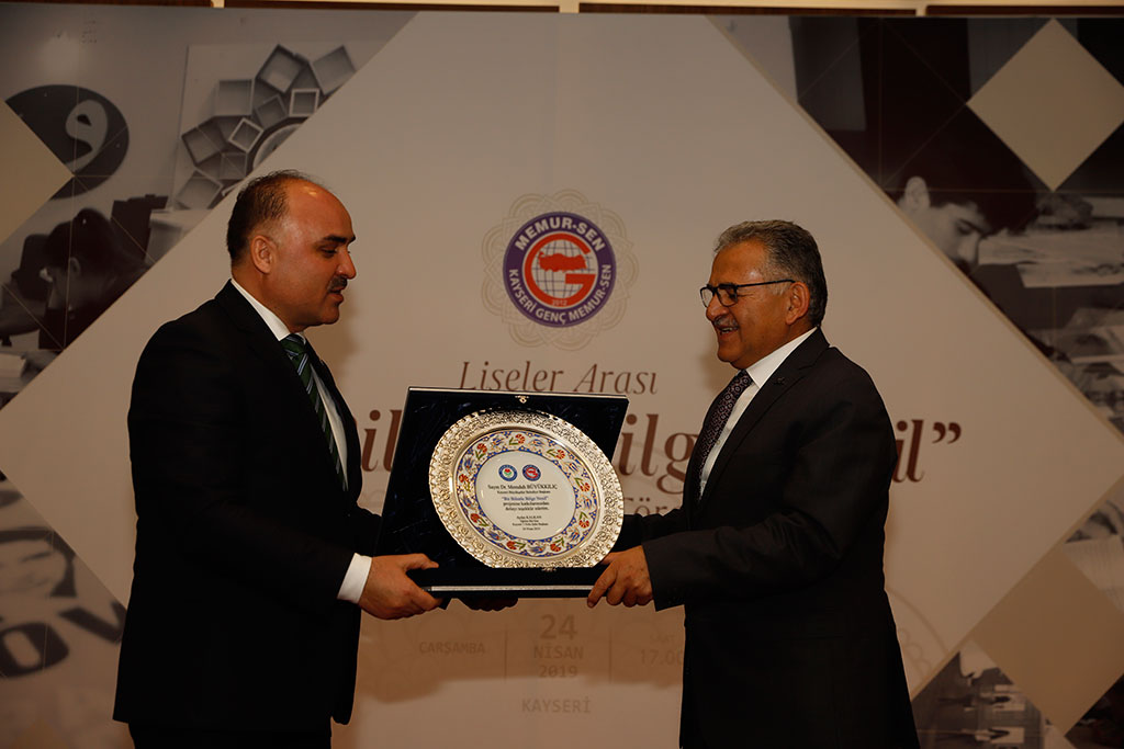 Kayseri Büyükşehir Belediye Başkanı Dr. Memduh Büyükkılıç, Eğitim Bir Sendikası Kayseri Şubesi’nce düzenlenen “Liselerarası Bir Bilenle Bilgi Nesil” projesinin ödül törenine katıldı. Törende gençlerin daha donanımlı olması için çalıştıklarını ifade eden Başkan Büyükkılıç, Kayseri’de tekli öğretime geçilmesini olmazsa olmaz olarak gördüklerini belirtti ve bunun için devlet, hayırseverler ve yerel yönetimler olarak çalıştıklarını kaydetti. Büyükşehir Belediye Başkanı Memduh Büyükkılıç, Eğitim Bir Sendikası Kayseri Şubesi’nce düzenlenen “Liselerarası Bir Bilenle Bilgi Nesil” projesinin ödül töreninde eğitimle ilgili açıklamalarda bulundu. “SIRADAN OLMAMALISINIZ” Konuşmasında gençlere seslenen Başkan Büyükkılıç, “sıradan olmayın” mesajı verdi. Gençliğin daha donanımlı olması için gayret ettiklerini ifade eden Başkan Büyükkılıç, “Yeri geldiğinde Fetih nesli, yeri geldiğinde Diriliş nesli yeri geldiğinde Asım’ın neslisiniz. Ay yıldızlı bayrağımıza, vatanımıza, milletimize, devletimize bağlı olarak devletimizin ve milletimizin sunmuş olduğu imkanları en iyi şekilde değerlendirmek asli göreviniz olmalıdır. Bulunduğunuz yerin en donanımlısı olmalısınız ve sıradan olmamalısınız. Başarılı olmak ve insanlığı aydınlatmak istiyorsanız donanımlı olacaksınız. ‘Ya öğrenen ya öğreten ol, üçüncüsü olma helak olursun’ öğretisi gereği hepimiz öğrenen olma yolunda gayret etmeliyiz” dedi. “ALDATAN VE ALDANAN OLMAYACAKSINIZ” Konuşmasında tekli öğretim üzerinde de duran Başkan Memduh Büyükkılıç, sözlerini şöyle sürdürdü: “Yerel yöneticiler olarak sizlerin bilgiye ulaşmasını sağlamak amacıyla gece gündüz koşturuyoruz. Sayın Valimizin de duyarlılık gösterdiği tekli eğitimi olmazsa olmaz olarak görüyoruz. İnşallah hayırseverlerimiz, hükümetimiz ve yerel yönetimlerimizle bunu sağlayacağız. Çünkü sizlerin daha iyi koşullarda eğitiminizi sürdürmenizi istiyoruz. Sizler donanımlı olursanız aldananlardan ve aldatanlardan olmayacaksınız.” Ödül töreninde Başkan Memduh Büyükkılıç’a projeye verdiği destekler nedeniyle bir plaket takdim edildi. Başkan Büyükkılıç, plaketini Vali Şehmus Günaydın’dan aldı. Başkan Büyükkılıç da proje kapsamında ödüle layık görülen öğrencilere ödüllerini verdi.