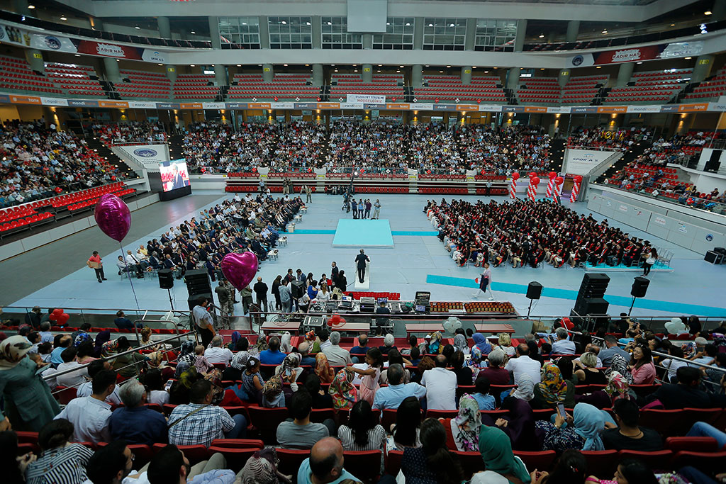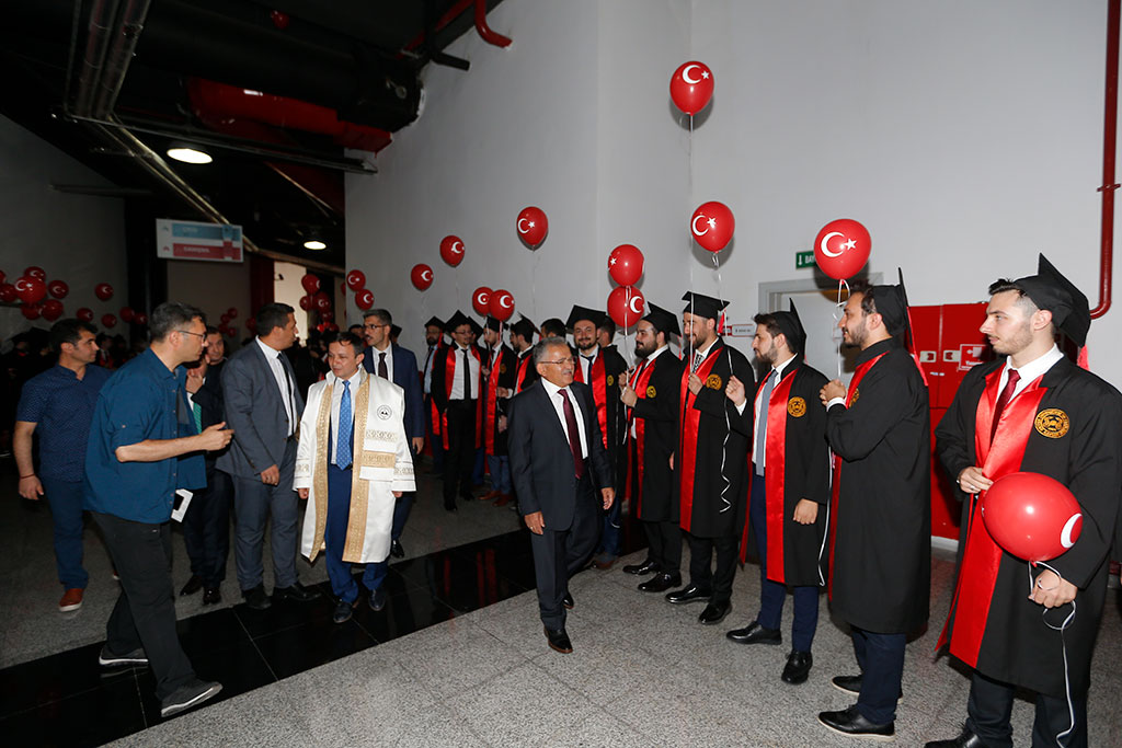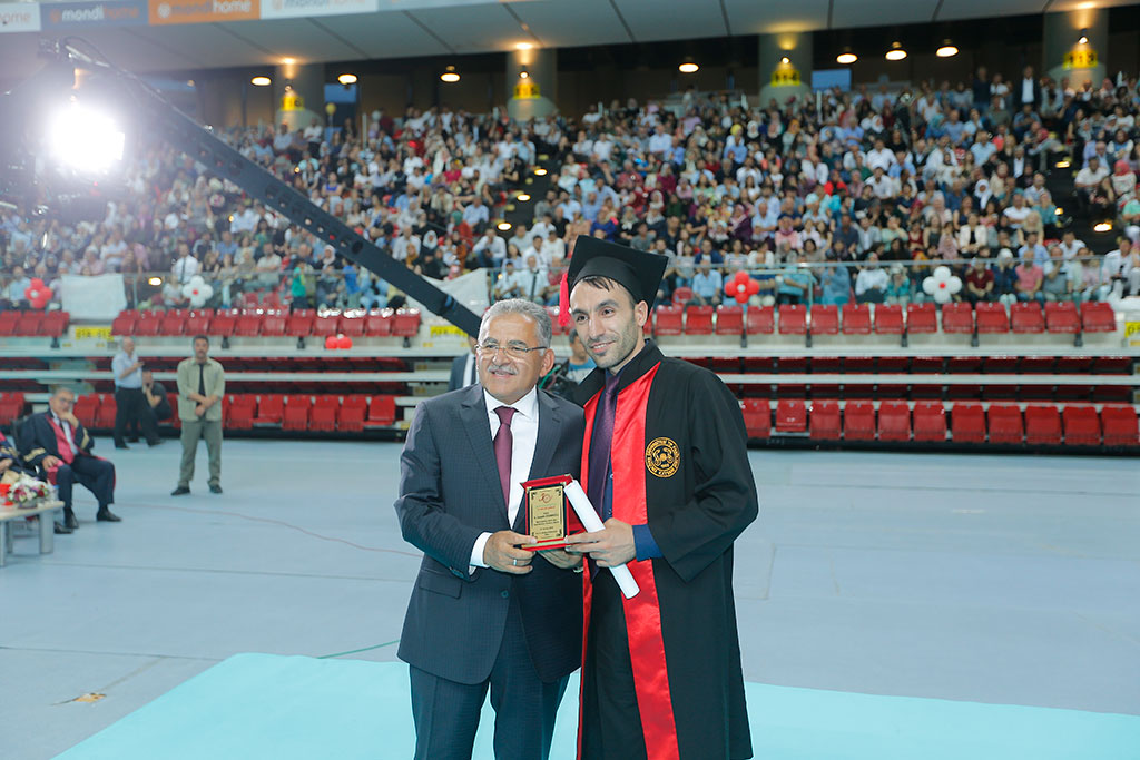 Kayseri Büyükşehir Belediye Başkanı Dr. Memduh Büyükkılıç, Erciyes Üniversitesi Tıp Fakültesi’nin mezuniyet töreninde tıp doktoru, şehir doktoru ve gönül doktoru unvanlarıyla anılmaktan duyduğumu memnuniyeti ifade etti. Genç meslektaşlarına seslenen Başkan Büyükkılıç, aidiyet vurgusu yaptı. Büyükşehir Belediye Başkanı Dr. Memduh Büyükkılıç, Vali Şehmus Günaydın ve Sağlık Bakan Yardımcısı Emine Alp Meşe ile birlikte Erciyes Üniversitesi Tıp Fakültesi’nin 45. Dönem mezuniyet törenine iştirak etti. Sözlerinin başında “Tıp doktoru, şehir doktoru ve gönül doktoru” unvanlarıyla anılmaktan duyduğu mutluluğu dile getiren Başkan Büyükkılıç, “Sevgili meslektaşlarım” diyerek söze başladı ve genç doktorları tebrik ederek başarılar diledi. Konuşmasında aidiyet vurgusu yapan Başkan Büyükkılıç, “İnşallah şehrimizde kaldığınız sürece aidiyet duygusu oluşturmuşuzdur ve umarım ki Kayseri’mizden memnun ayrılacaksınız. Hayatınız boyunca Ay Yıldızlı Türk Bayrağımıza, vatanımıza, milletimize, devletimize, şehrimize ve insanımıza sahip çıkacaksınız. Bu duygularla hayatınız boyunca başarılı olmanızı diliyorum” dedi. Konuşmaların ardından dereceye girenlere ve mezunlara diplomaları verildi.
