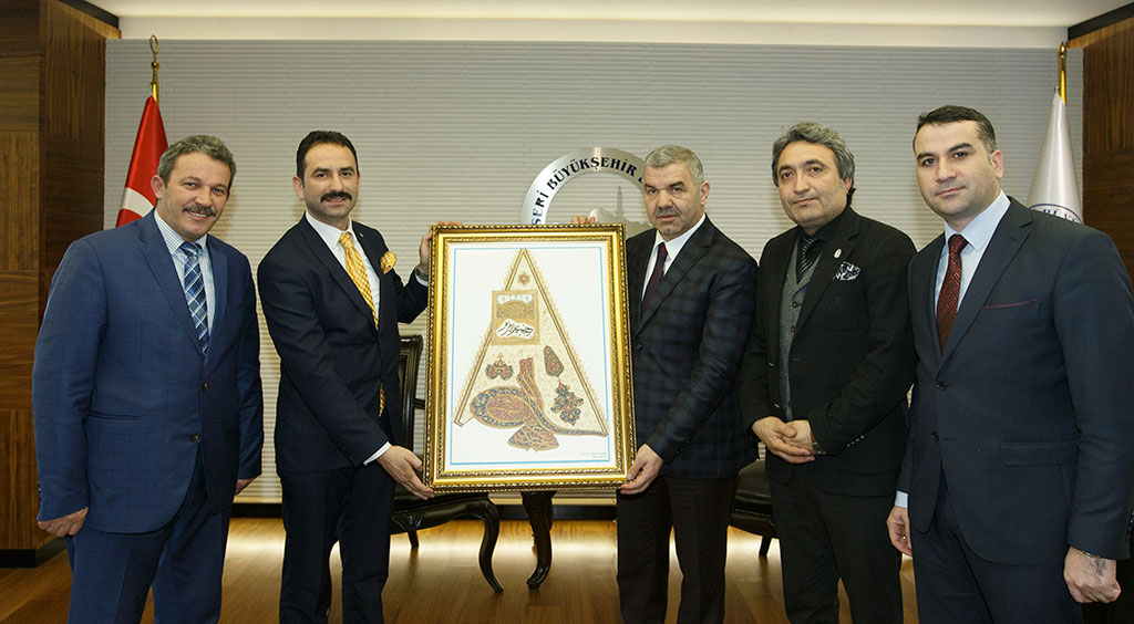 TÜMKAYDER Yönetim Kurulu Başkanı Muhammed Ali Temel ve yönetim kurulu üyeleri Büyükşehir Belediye Başkanı Mustafa Çelik’i ziyaret ettiler. Başkan Çelik, ziyarette hemşehri derneklerinin önemini vurguladı. Merkezi İstanbul’da olan Tüm Kayserililer Yardımlaşma ve Kültür Derneği (TÜMKAYDER) yaptığı genel kurulla yönetimini yeniledi. Yeni yönetimin hayırlı olması dileğinde bulunan Büyükşehir Belediye Başkanı Mustafa Çelik, acıların paylaşıldıkça azaldığını ve mutlulukların paylaşıldıkça arttığını belirterek, hemşehri derneklerinin bu anlamda önemli görevler üstlendiğini söyledi. Kayserililerin Kayseri dışında da bir arada olmasının önemine işarete eden Başkan Çelik, Kayseri’nin başka şehirlerde de güçlü bir şekilde temsil edilmesi gerektiğini belirtti. TÜMKAYDER Yönetim Kurulu Başkanı Muhammed Ali Temel de, Kayseri’de yapılan yatırımlardan mutluluk duyduklarını ifade ederek, “Sayın Başkanım, sizin enerjiniz, dinamikliğiniz bizi de motive edecek. Kayseri’yi dünden beri geziyoruz. Görüyoruz ki, çok büyük projelere imza atmışsınız. Allah her zaman yardımcınız olsun. Her zaman gururumuzsunuz ve öyle olmaya devam edeceksiniz. Biz de her zaman emrinizdeyiz” diye konuştu. Ziyarette TÜMKAYDER Başkanı Temel, Başkan Çelik’e bir tablo hediye etti.