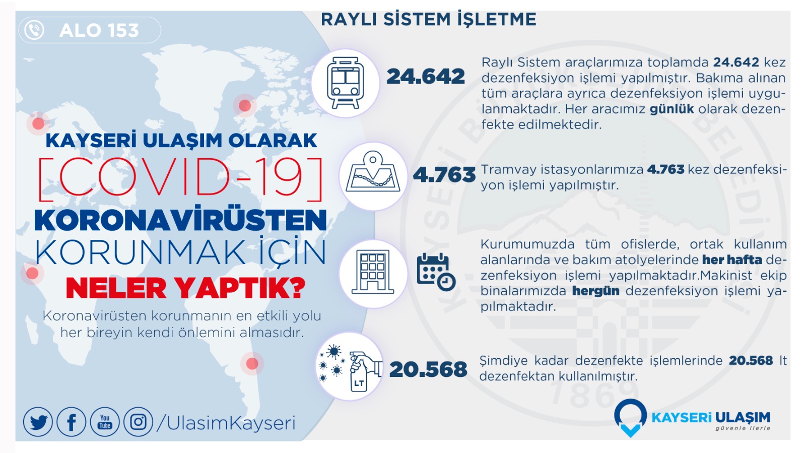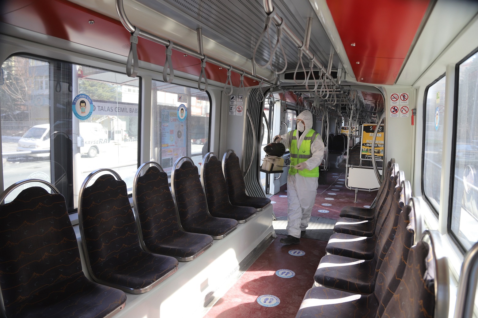 Kayseri Büyükşehir Belediyesi Ulaşım A.Ş. tüm dünyayı etkisi altına alan korona virüs ile ulaşım ağında mücadele kapsamında bu zamana kadar özel halk otobüslerine, ilçe toplu taşımacılığına ve raylı sisteme ait tüm araçlara yaklaşık 100 bin kez dezenfeksiyon işlemi yaptı.