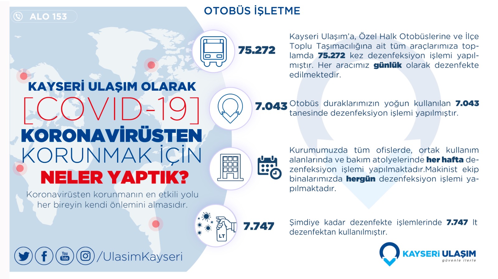 Büyükşehir Belediyesi şehirdeki ulaşım ağını korona virüsten korumak için birçok tedbir aldı. Bu kapsamda Büyükşehir Belediyesi Ulaşım A.Ş. tarafından Kayseri Ulaşım’a, özel halk otobüslerine ve ilçe toplu taşımacılığına ait tüm araçlarına toplamda 75 bin 272 kez dezenfeksiyon işlemi yapıldı ve günlük olarak dezenfekte ediliyor. Öte yandan yoğun kullanılan otobüs duraklarının 7 bin 43 tanesine de dezenfeksiyon işlemi yapıldı.