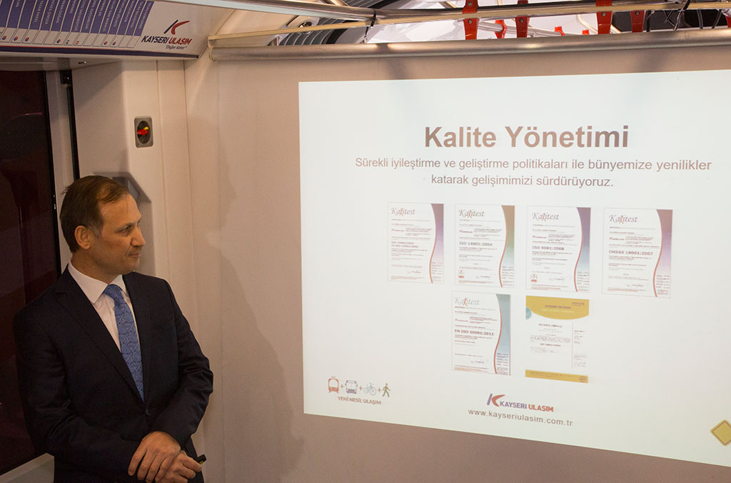 Ulaşım A.Ş.’nin, kurulduğu günden itibaren kurumsallaşmaya önem verdiğini belirten Gündoğdu, ISO 9001 Kalite Yönetim Sistemi ile ISO 14001, ISO 18001, ISO 10002, ISO 14064, ISO 50001 standartları aldıklarını ve etkin olarak kullandıklarını söyledi. 34 km hat uzunluğuna ve 55 istasyona ulaşan raylı sistemde 68 araçla hizmet verildiğini ifade eden Gündoğdu, bu araçlardan 30’unun yerli üretim olduğunu vurguladı. Gündoğdu, “2014 yılında Kayseri Büyükşehir Belediye Başkanlığını yürüten Sayın Mehmet Özhaseki’nin önderliğinde ve yönlendirmesiyle yerli üretimi teşvik edecek ama yabancı firmaların ihaleye girmesini engellemeyecek şekilde teknik şartnameler hazırlanmıştır. İhale karar süreçlerinde, Kalite, performans, işletme ve bakım giderleri gibi fiyat dışı unsurların değerlendirilmesinin yasal olarak mümkün olmasından dolayı, bu unsurları kapsayacak şekilde hazırlanmış olan ihale dokümanları neticesinde hem fiyat avantajı hem de teknik olarak üstünlük gösteren yerli firma ihaleyi kazanmıştır. Bir önceki araç alım ihalesi fiyatına göre 900 bin Euro daha avantajlı olarak alınan yeni raylı sistem araçları ile birlikte 30 araçlık filo için 27 milyon Euro daha az ödeme yapılmıştır. Kayseri Büyükşehir Belediyesinin yerli araç temin etmesi ile birlikte yerli üreticiler daha etkin hale gelmiş ve farklı şehirler de yerli araç alımı yönünde tercihlerini kullanmışlardır. Sayın Mustafa Çelik Başkan göreve geldikten sonra projeyi sahiplenmiş, onun da desteği ile birlikte yerli raylı sistem araçları, seri üretimleri tamamlanarak 2016 yılı içinde hizmete alınmaya başlanmıştır. Yerli raylı sistem araçlarımız muadillerine göre bakım ve işletme giderlerinde daha avantajlı ve daha yüksek performansa sahiptir. Yeni araçlarımız tasarım olarak yüzde yüz yerli, donanım anlamında yüzde 60 oranında yerlilik payına sahiptir. Üretimi Ankara-Sincan’ da yapılmıştır.”