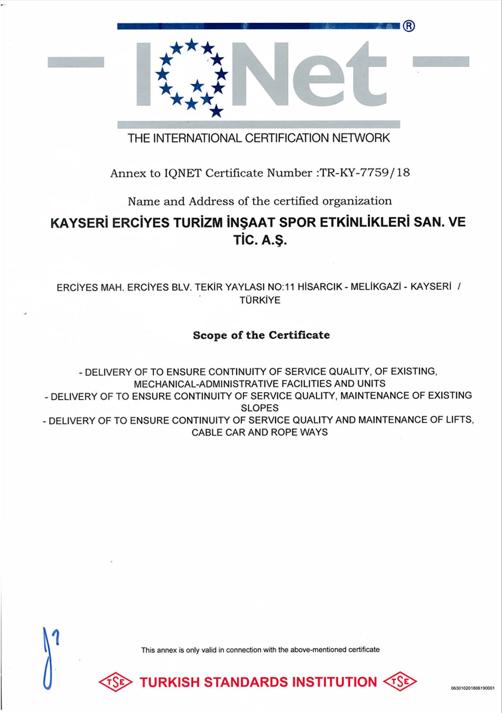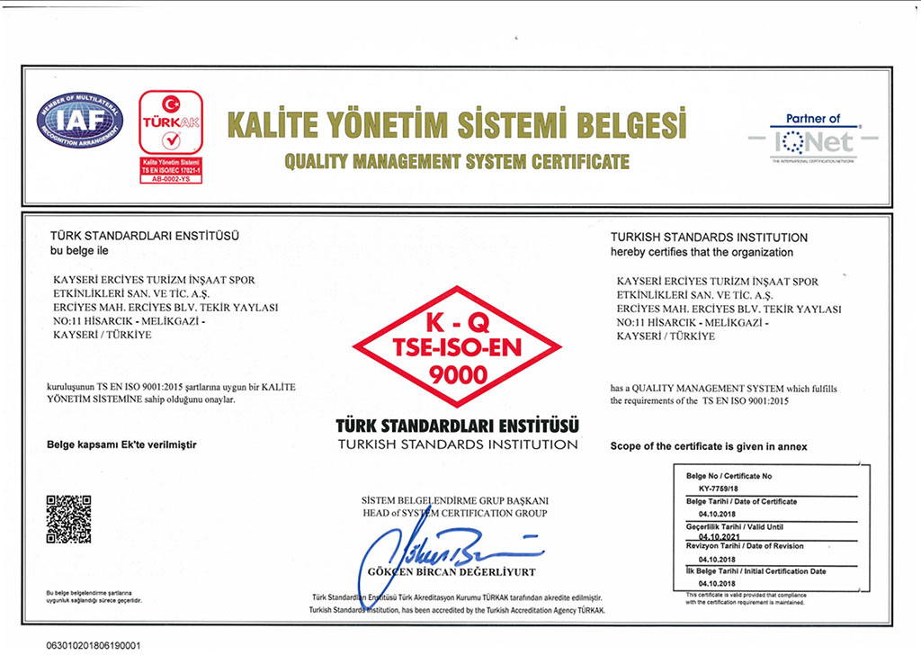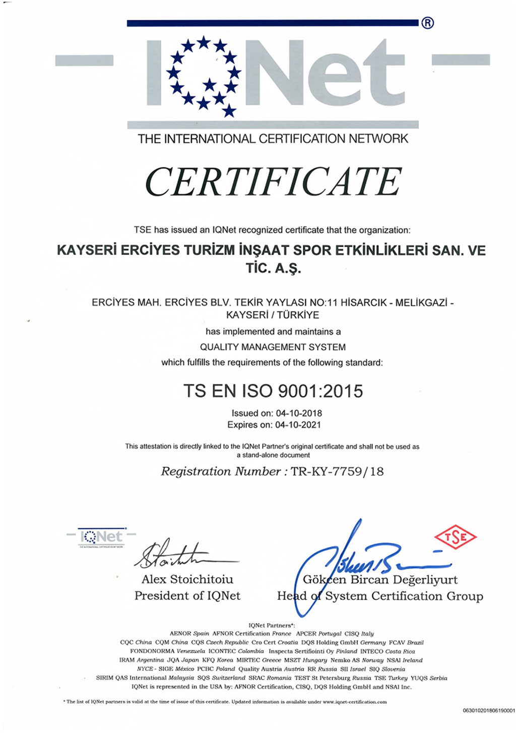 Kayseri Büyükşehir Belediye Başkanı Mustafa Çelik, Erciyes Kış Sporları Merkezi’nin kalitesinin uluslararası anlamda tescillendiğini açıkladı ve ülkemizin uluslar arası kalitedeki tek kış sporları merkezinin Erciyes olduğunu belirtti. TSE Bölge Koordinatörü Mahmut Ulaş, TSE ISO 9001 ve IQ Net belgelerini Başkan Mustafa Çelik’e verdi. Kayseri Büyükşehir Belediyesinin devasa yatırımları ile Türkiye’nin en büyük ve gelişmiş kayak merkezi konumuna gelen Erciyes, son teknoloji ile donatılmış mekanik tesisleri, Alpler standardında pistleri, donanımlı insan kaynağı, hizmet kalitesi ile dünya çapında bir kayak merkezi olduğunu resmi olarak kanıtladı. Türkiye’nin ilk ve tek profesyonel dağ yönetim şirketi Kayseri Erciyes A.Ş. tarafından yönetilen Erciyes Kayak Merkezi, Uluslararası Standardlar Organizasyonu (ISO) Uluslararası Akreditasyon Forumu (IAF), Uluslararası Belgelendirme Birliği (IQNet), Türk Standardları Enstitüsü (TSE) ve Türk Akreditasyon Kurumu (TÜRKAK) tarafından verilen ISO 9001-2015 Kalite Yönetim Sistemi Belgesi ve Uluslararası Tanınırlık Belgesi olan IQNet’i almaya hak kazandı. Erciyes Dağı’nın 26 milyon m2 üzerine inşa edilen yatırımların mekanik tesislerin çalıştırılması ve bakımı, idari tesislerin ve birimlerin düzenli bir şekilde çalışmasını, dağ genelinde mevcut pistleri hazır hale getirerek hizmet kalitesinin sürekliliğini sağlayan Erciyes A.Ş. TSE’nin denetimleri sonucu tam puanla Kalite Yönetim Sistemi’ni başarıyla uyguladığını ISO 9001-2015 belgesi ile ispatlayıp, IQNET sertifikası ile de kalitesini global olarak onaylattı. TSE Bölge Koordinatörü Mahmut Ulaş, ISO 9001 ve IQ Net belgelerini Büyükşehir Belediye Başkanı Mustafa Çelik’e verdi. “YAPTIĞIMIZ İŞLERİN KALİTESİ BELGELENDİ” Büyükşehir Belediye Başkanı Mustafa Çelik, Erciyes Kış Sporları Merkezi’ni, aldıkları standart belgesiyle taçlandırdıklarını belirtti. Uluslararası ISO 9001 ve IQ Net belgelerini alarak Erciyes’i uluslararası seviyede bir kaliteye ulaştırdıklarını vurgulayan Başkan Çelik, “Buradaki tesislerimiz, servis, acil durum hizmetleri gibi tüm çalışmalar bir bütün olarak incelendi ve kalitesi bu sertifikasyonla belgelenmiş oldu. Türkiye’de kayak merkezleri içinde sadece Erciyes Kış Sporları Merkezi bu belgeyi almaya hak kazandı. Şu anda sadece Erciyes kalite belgeli bir kayak merkezi durumunda. Yaptığımız hizmetlerin ne derecede kaliteli ve nitelikli olduğu belgelenmiş oldu” diye konuştu. “IQ NET SERTİFİKASI AYRI BİR GÜZELLİK” TSE Bölge Koordinatörü Mahmut Ulaş da, uzun bir çalışmanın sonucunda belgelendirmenin yapıldığını ifade ederek, “Yaklaşık 1 yıllık süreç nihai aşamaya geldi. Ciddi bir teknik ekip Ar Ge yaptı. Dokümantasyon hazırlığını ve sahada uygulama sürecini geçtiğimiz kış tamamladık. İnşallah bu yıl Erciyes sertifikasıyla birlikte yönetim sistemini uygulayacak. Uluslararası boyutuyla IQ Net sertifikasına da haiz olması ayrı bir güzellik oldu” dedi. “ULUSLARARASI PAZARLAMADA ÇOK ÖNEMLİ” Erciyes A.Ş. Yönetim Kurulu Başkanı ve Genel Müdürü Dr. Murat Cahit Cıngı da, alınan belgenin uluslararası anlamdaki önemine vurgu yaptı. Büyükşehir Belediyesi’nin yatırımlarından sonra müşteri odaklı işletmeye endekslendiklerini ifade eden Cıngı, “Müşteri odaklı çalışmalarımızın alt yapısını tamamlamıştık. Türkiye’deki en iyi yönetilen dağın Erciyes olduğu zaten tüm ülkede biliniyordu. Son yıllarda yaptığımız çalışmalar sonucu direk uçuş seferleriyle çok sayıda yabancı turistin gelmeye başlaması nedeniyle müşteri odaklı çalışmalarımızı uluslararası standart haline getirip belgeleme ihtiyacı hissetmiştik. Allah’a çok şükür başardık. Bizim açımızdan uluslararası pazarlamada çok önemli bir enstrüman olacak” şeklinde konuştu.