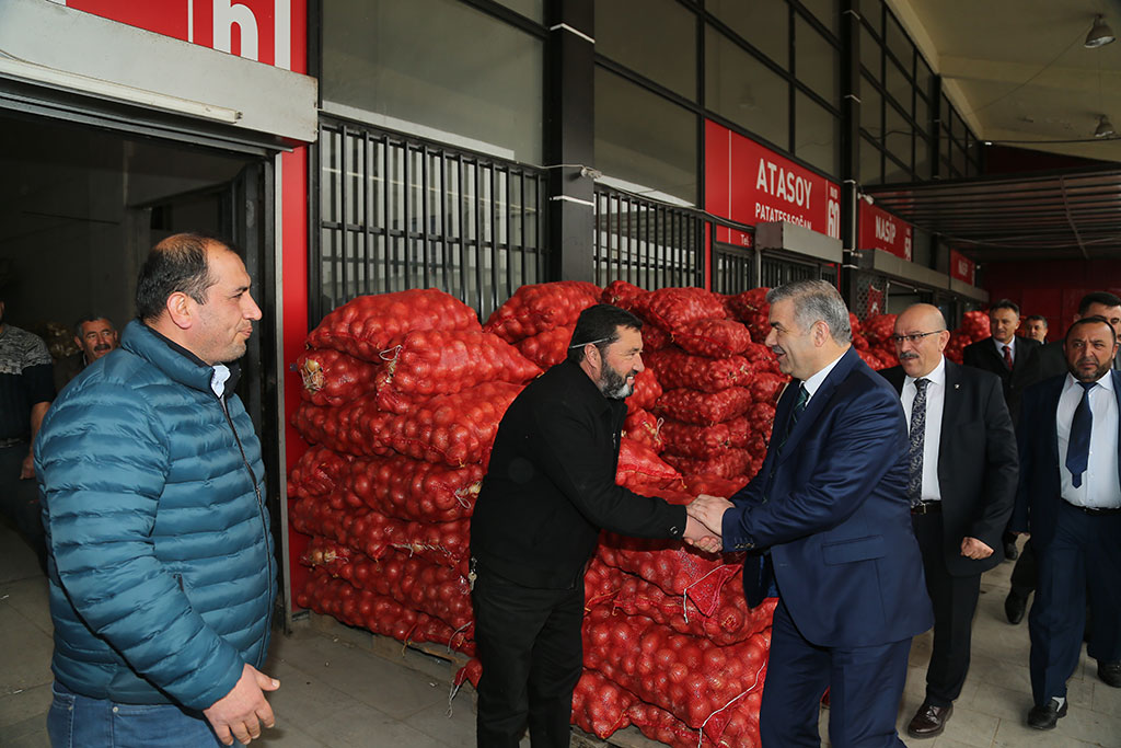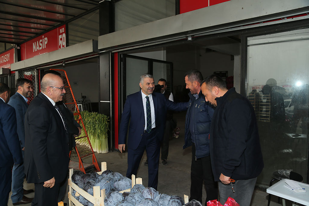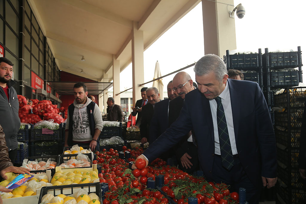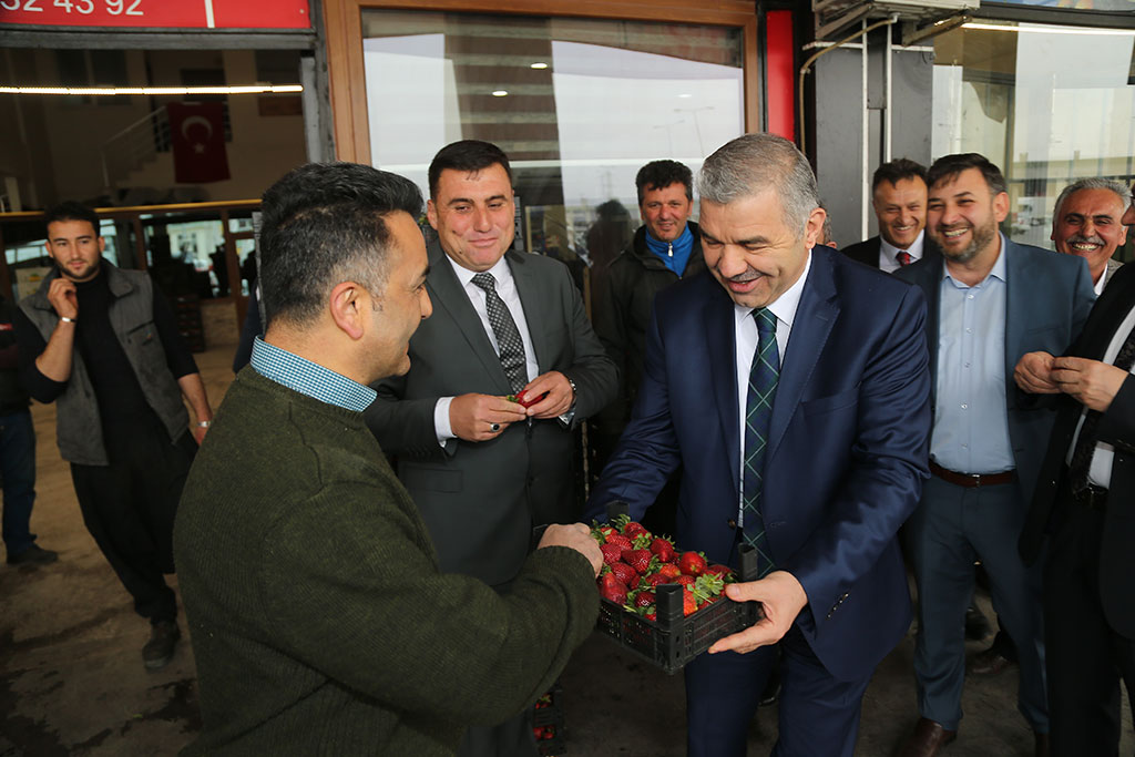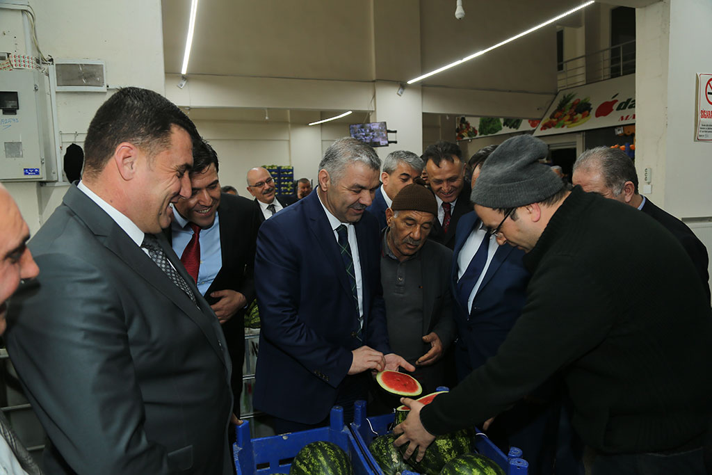Büyükşehir Belediye Başkanı Mustafa Çelik, Kayseri Hali’ndeki esnafları ziyaret ederek üreticinin her zaman yanında olduklarını belirtti. Başkan Çelik, haldeki esnafları gezerek “Hayırlı İşler” temennisinde bulundu. Büyükşehir Belediye Başkanı Mustafa Çelik, AK Parti İl Başkanı Hüseyin Cahit Özden ile birlikte öncelikle Kayseri Meyve Sebze Komisyoncuları Derneği Başkanı Yüksel Garip’i ziyaret ederek bir süre görüştü. Başkan Çelik’in Kayseri’ye yaptığı yatırımlarla Türkiye’de örnek bir şehir haline getirdiğini ifade eden Yüksel Garip, “Halimiz de Türkiye’nin örnek bir hali oldu. Esnafımızın her zaman yanında oldunuz. Destekleriniz nedeniyle teşekkür ederiz” dedi. Türkiye’de sadece seçimden seçime gelen bildik siyasetçi tarzının yok olduğunu ifade eden Başkan Mustafa Çelik de “Kayseri Haline defalarca geldim. Esnafla, halkla bir arada olmak bizim düsturumuz. Şimdiye kadar olduğu gibi bundan sonra da hal esnafımızın ihtiyaçları ne varsa gidermek için çalışacağız. Bugüne kadar Kayseri’de her esnafın yeni iş yeri talebi gelince tüm desteği verdik. Gerek imar düzenlemesi gerek arazi tespiti gerek yapımında yanlarında olduk. Bu sayede birçok esnaf sitesi yapıldı. Bu yönüyle de Türkiye’ye örnek oluyoruz. Mobilyacılar, oto servisçiler, matbaacılar, hurdacılar terziler gibi bir çok meslek erbabına bu imkanı sağladık. Çünkü sizler istihdam oluşturuyor, verdiğiniz vergilerle kaynak oluşturuyorsunuz” diye konuştu. Büyükşehir Belediye Başkanı Mustafa Çelik, ziyaretin ardından hal içinde yapılan çalışmaları takip etti. Daha sonra esnafı tek tek ziyaret eden Başkan Çelik, “Hayırlı İşler” temennisinde bulundu. Esnafları iş yerlerinde ziyaret ederek onlarla sohbet eden Başkan Çelik, bir ziyareti sırasında çilek alarak beraberindekilere ikramda bulundu.