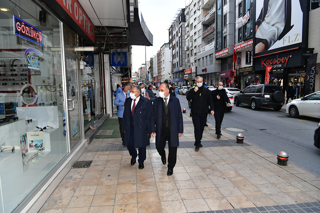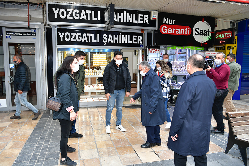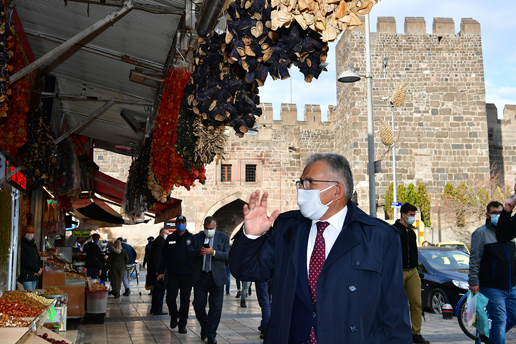 Büyükşehir Belediye Başkanı Memduh Büyükkılıç, Kayseri Valisi Şehmus Günaydın ile birlikte maske, mesafe ve temizlik konusunda vatandaşları ve esnafları uyarmaya devam ediyor. Bu kapsamda Başkan Büyükkılıç ile Vali Şehmus Günaydın Cumhuriyet Meydanı’ndan başlayarak, İnönü Bulvarı’na kadar esnaf ve vatandaşlara salgın süresince dikkat edilmesi gereken kurallar için uyarılarda bulundu. Ayrıca Başkan Büyükkılıç, kent genelinde denetimlerin sürdürdüklerini ve tedbirlerin alınmasının salgınla mücadele çok önemli olduğunu ifade etti. Büyükşehir Belediye Başkanı Dr. Memduh Büyükkılıç ile Vali Şehmus Günaydın kent merkezinde koronavirüs denetimi yaptı. Denetimlerde esnaf ve vatandaşları özellikle maske ve sosyal mesafe konusunda uyaran Başkan ve Vali tedbirlere ve kurallara uyulmaması durumunda virüsün yayılma hızına dikkat çekti. Salgın süresince vaka artışlarının önüne geçilmesi adına Kayseri’de gereken önlemleri alan ve her fırsatta vatandaşlara uyarılarda bulunan Büyükşehir Belediye Başkanı Dr. Memduh Büyükkılıç, denetimleri sık sık yapacaklarını da dile getirdi.