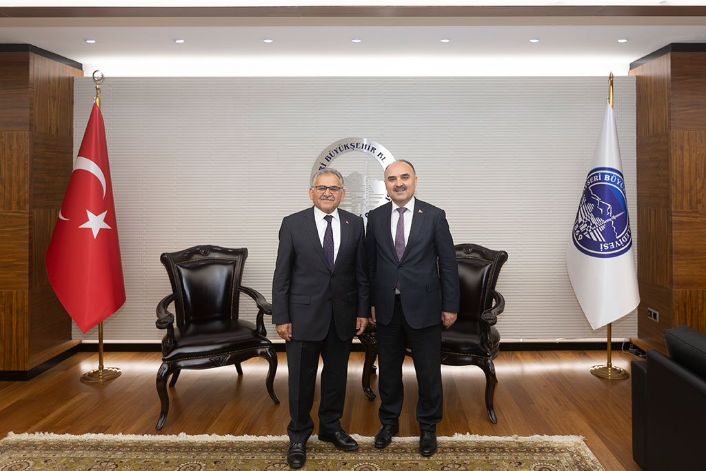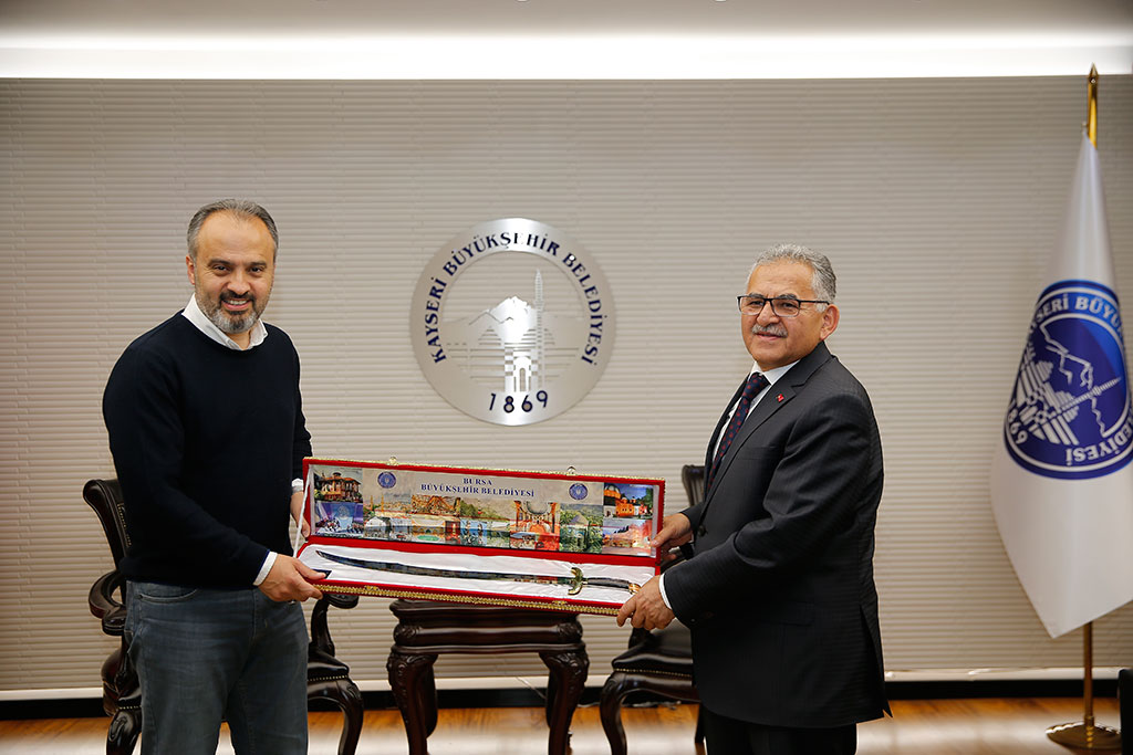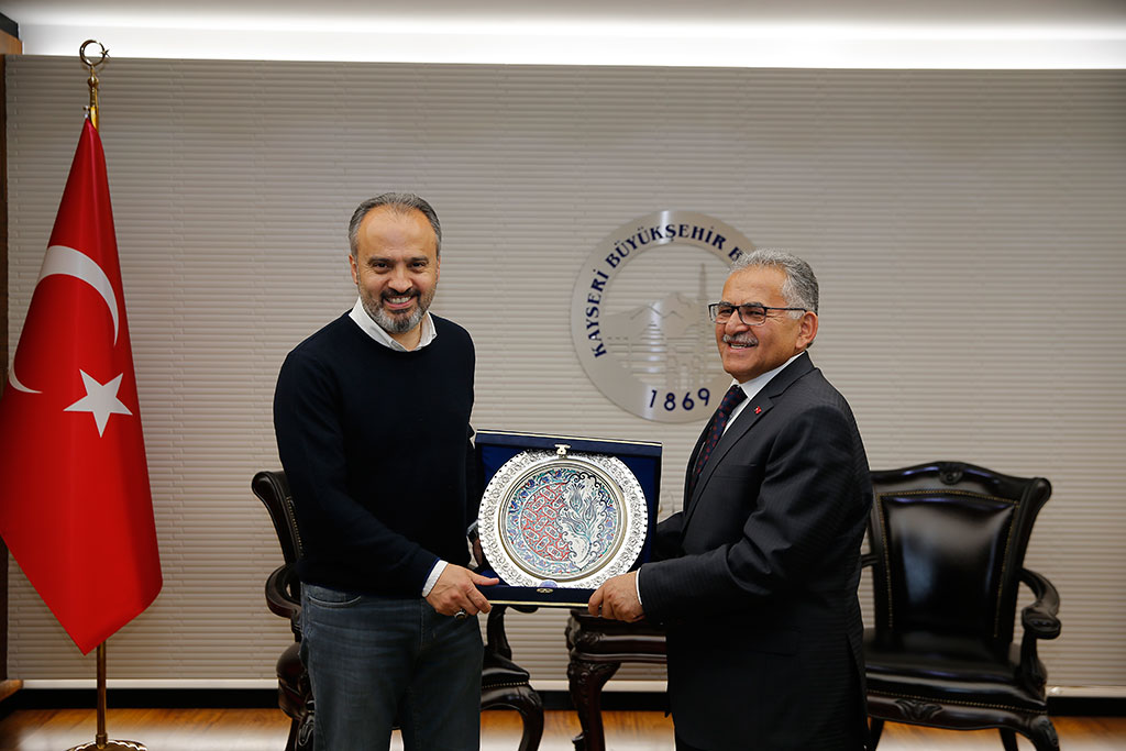 Vali Şehmus Günaydın, Büyükşehir Belediye Başkanı Dr. Memduh Büyükkılıç’ı ziyaret ederek hayırlı olsun dileklerinde bulundu. Başkan Büyükkılıç’ı ayrıca Bursa Büyükşehir Belediye Başkanı Alinur Aktaş da ziyaret etti. Büyükşehir Belediye Başkanı Dr. Memduh Büyükkılıç, Vali Şehmus Günaydın’ı, ziyaretine gelen Bursa Büyükşehir Belediye Başkanı Alinur Aktaş ile birlikte Başkanlık girişinde karşıladı. Başkan Büyükkılıç, Vali Günaydın ile bir süre baş başa görüştü ve nazik ziyaretleri için teşekkür etti. Vali Günaydın da Başkan Büyükkılıç’a hayırlı olsun dileklerini iletti. ALİNUR AKTAŞ KAYSERİ’DE Büyükşehir Belediye Başkanı Memduh Büyükkılıç’ı Bursa Büyükşehir Belediye Başkanı Alinur Aktaş da ziyaret etti. Ziyarette karşılıklı hediyeler takdim edildi. Büyükkılıç ve Aktaş bir süre baş başa görüşerek karşılıklı görüş alışverişinde bulundu.