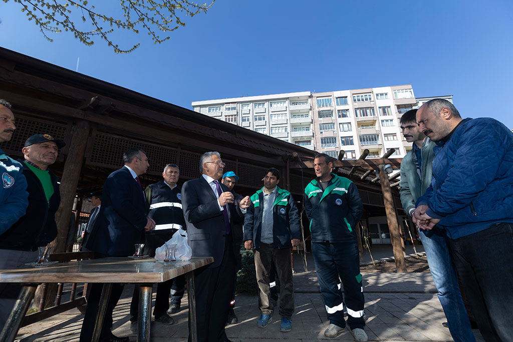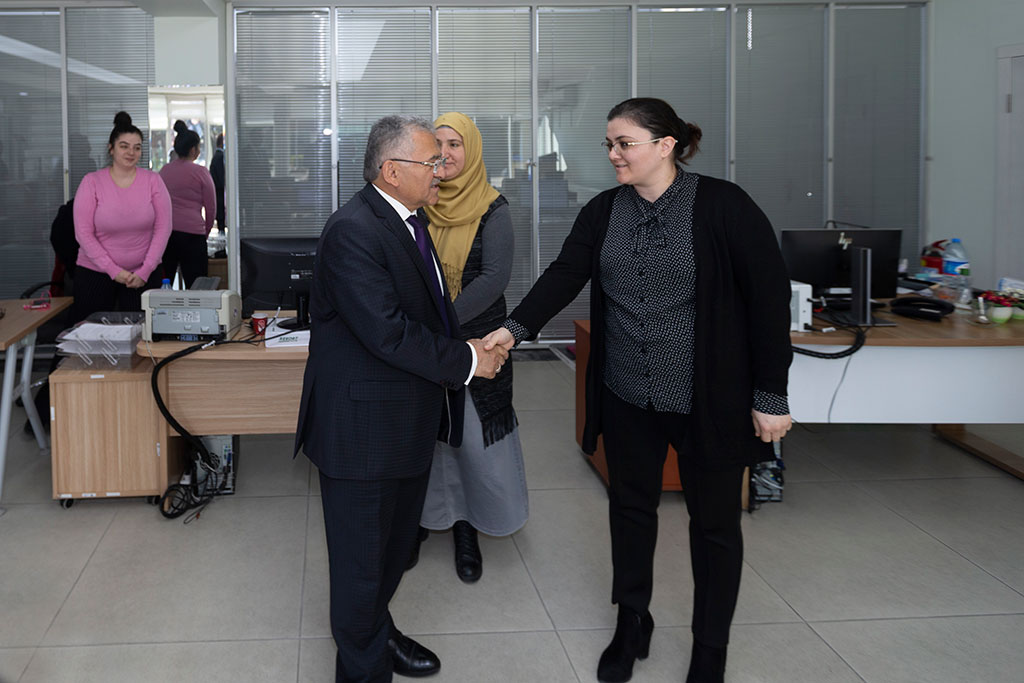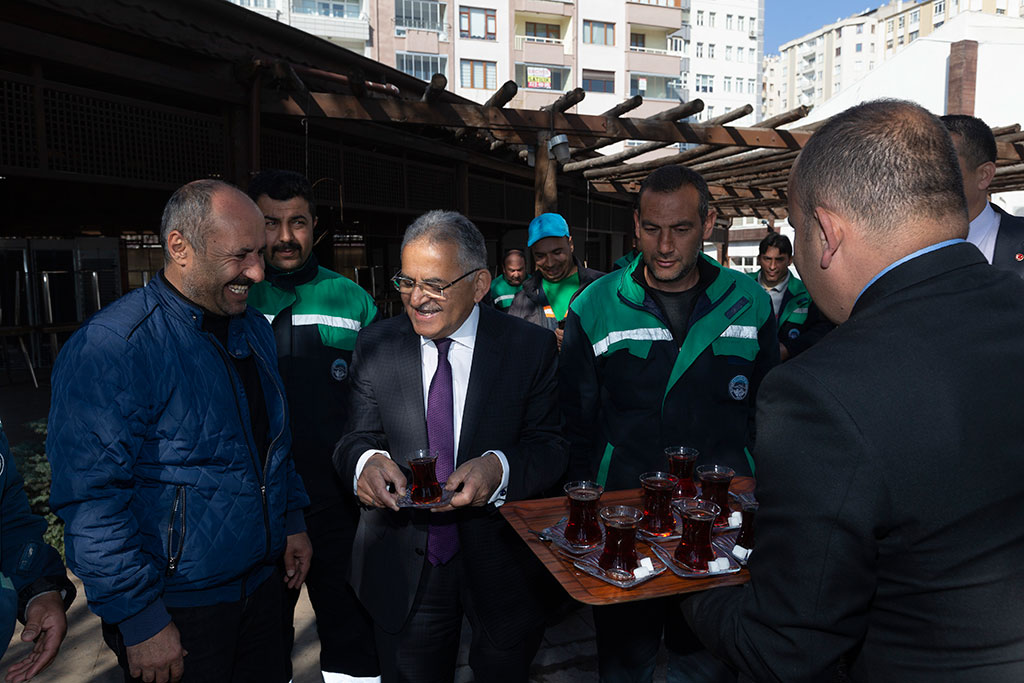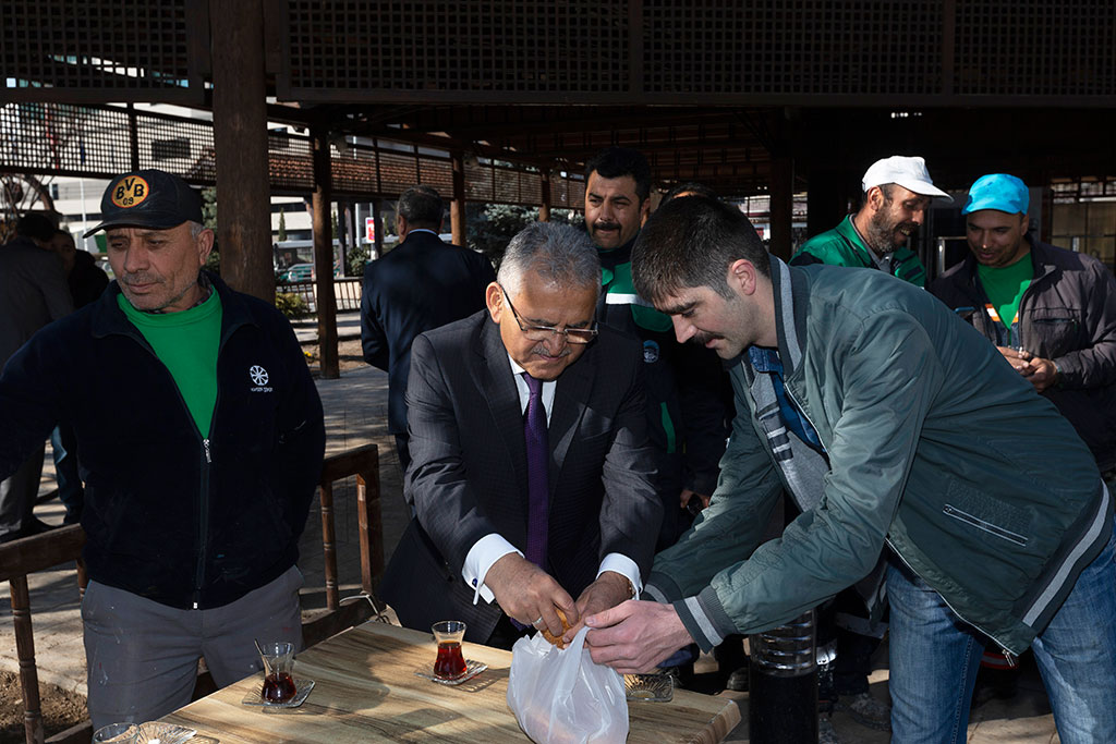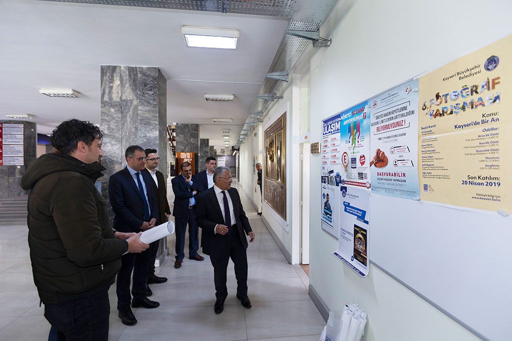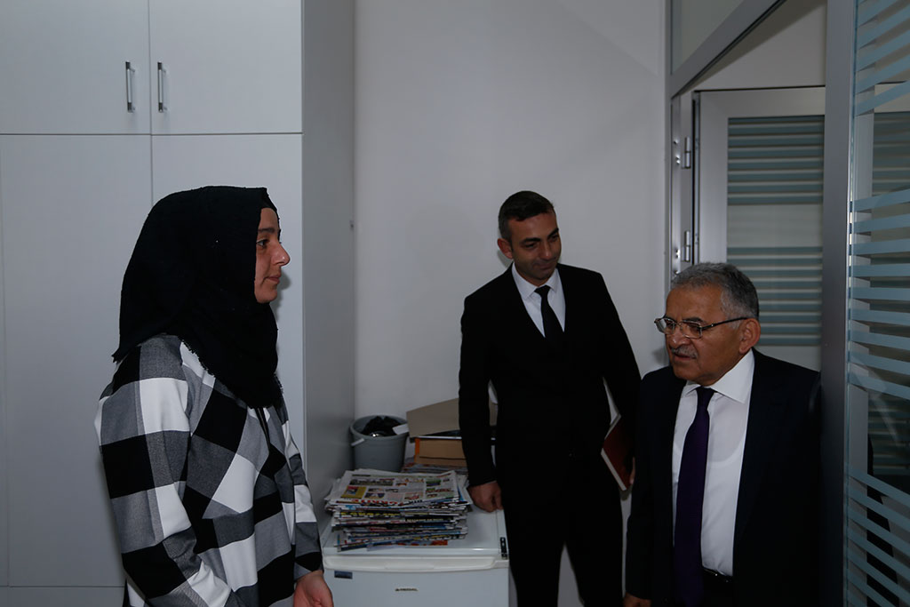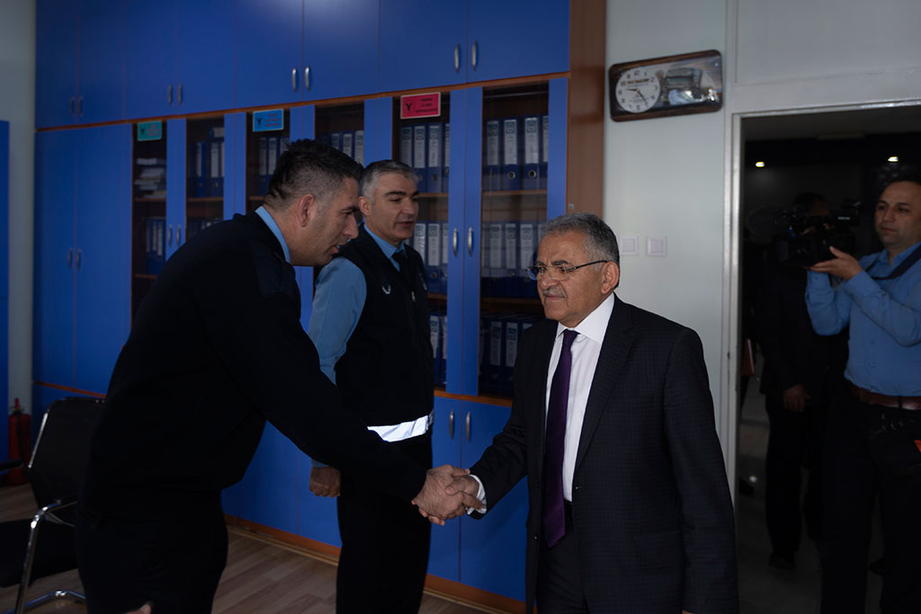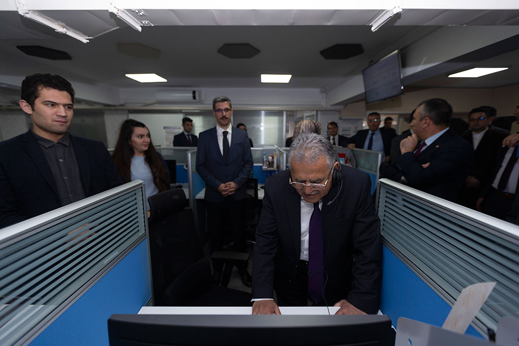 Kayseri Büyükşehir Belediye Başkanı Dr. Memduh Büyükkılıç, gece yarısı ayrıldığı belediye hizmet binasındaki 2’nci gününe sabahın erken saatlerinde birim ziyaretleri ile başladı. Alo 153 Çağrı Merkezi’nde de incelemelerde bulunan ve burada gelen bir çağrıya cevap veren Başkan Büyükkılıç’ı vatandaşın sesinden tanıması renkli görüntüler oluşturdu. Büyükşehir Belediye Başkanı Memduh Büyükkılıç slogan haline getirdiği ve tüm personele işaret ettiği “Durmak Yok, Koşmaya Devam” sözünün gereğini yerine getirmeye devam ediyor. Mazbatasını alıp görevine başladığı günün 3’ncü saatinde üst düzey yöneticilerle 6 saat süren bir toplantı yapan ve gece yarısı Büyükşehir Belediyesi Hizmet Binası’ndan ayrılan Başkan Büyükkılıç, Büyükşehir mesaisinin ikinci gününe sabahın erken saatlerinde birimleri ziyaret ederek başladı. Hizmet binası girişinde çevre düzenlemesi yapan personelin yanına giderek kolaylıklar dileyen Başkan Büyükkılıç, personele çay ikramında bulunduktan sonra zemin katta bulunan birimleri ayrı ayrı ziyaret ederek hem personelle tanıştı hem görev ve sorumlulukları ile ilgili tavsiyelerde bulunarak, “Vatandaşımız baş tacımızdır. Gönüllerde olacağız. Herkesle yakından ilgilenmeli, işleri hızlıca sonuçlandırmalıyız” dedi. Başkan Büyükkılıç ile vatandaş arasında Büyükşehir Belediye Başkanı Dr. Memduh Büyükkılıç mesaiye Büyükşehir Belediyesi içerisindeki birimleri tek tek gezerek başladı. Birim ziyaretleri kapsamında 153 Alo Çağrı Merkezi’ni de ziyaret edip incelemelerde bulunan Başkan Büyükkılıç, gelen bir çağrıya da bizzat kendisi cevap verdi. İl Sağlık Müdürlüğünün numarasını öğrenmek için 153 Çağrı Merkezi’ni arayan Semra Sülünhat adlı vatandaşın kısa bir süre sonra Başkan Memduh Büyükkılıç’ı sesinden tanıması üzerine ortaya çıkan sohbet renkli görüntüler oluşturdu. Başkan Büyükkılıç’a hayır duasında bulunan Semra Sülünhat ile görüşen Başkan Büyükkılıç, “Sabah sabah bu duaları almak için burada olmam lazımmış. Cenabı Allah inşallah rızasına uygun hizmetler yaptırır. Sizin gibi güzel insanlara da bizleri layık kılar” şeklinde konuştu.