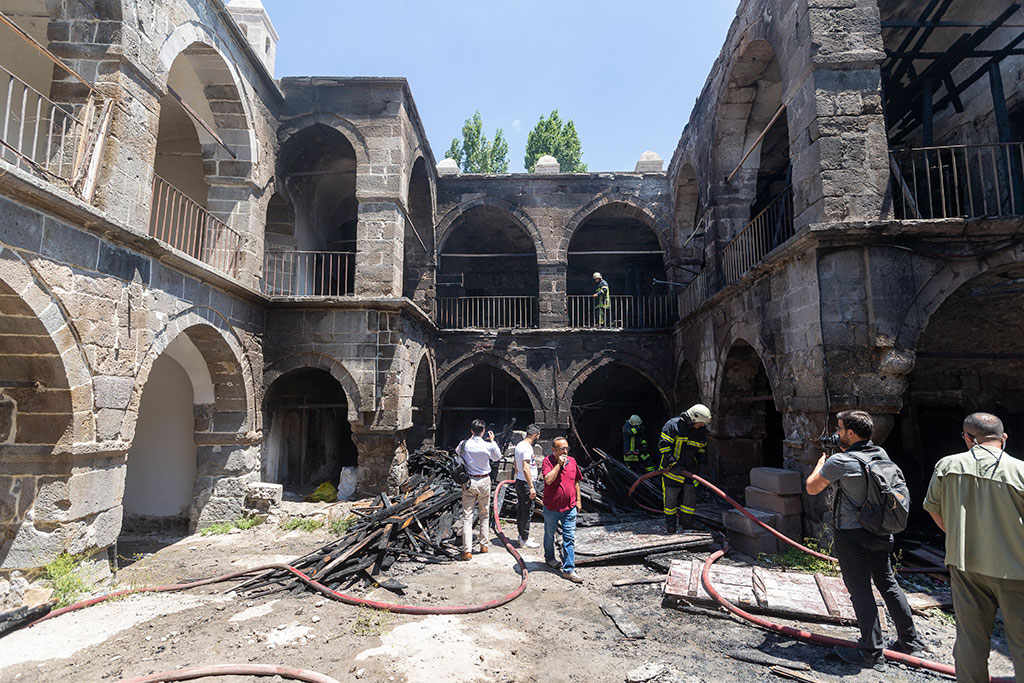 Kayseri Büyükşehir Belediye Başkanı Dr. Memduh Büyükkılıç, Vali Şehmus Günaydın ile birlikte Vezir Hanı’nda çıkan yangın sonrası incelemelerde bulundu. Vali Günaydın ve Başkan Büyükkılıç, yangına anında müdahale ederek Kapalı Çarşı’ya sirayetini önleyen İtfaiye Teşkilatına teşekkür etti. Vali Şehmus Günaydın ve Büyükşehir Belediye Başkanı Dr. Memduh Büyükkılıç, yangın söndürme çalışmalarının hemen ardından Vezir Hanı’na gitti. Vali Günaydın ve Başkan Büyükkılıç, bölgede incelemelerde bulundu ve yangınla ilgili bilgiler aldı. Yangının restorasyon çalışması için kurulan iskelenin yanında başladığını ifade eden Vali Şehmus Günaydın, “Yangına anında müdahale duvarların çökmesine engel olmuş. Çok şükür can kaybımız yok. Atıl vaziyetteki pencere ve kapılarda yanma söz konusu. Bu tür yangınların çıkmaması için herkesin dikkatli olması lazım. Buralar tarihi mekanlar. Buraları korumamız ve gelecek nesillere aktarmamız lazım. Restorasyon çalışmaları devam ediyor. Burada iki noktanın altını önemle çiziyorum. Birincisi itfaiyemizin anında müdahale etmesiyle yangının Kapalı Çarşı’ya sirayetinin önüne geçilmesi, ikincisi de burada çalışanların yangına erken müdahale etmesi. Arkadaşlarımıza gayretleri için teşekkür ediyorum” dedi. Büyükşehir Belediye Başkanı Memduh Büyükkılıç da Vezir Hanı’nın önemi üzerinde durdu. Belediyeler olarak Vezir Hanı’nın canlanması için büyük gayretler gösterdiklerini ifade eden Başkan Büyükkılıç, “Burası Camii Kebir ve Kapalı Çarşı’nın yanında. Önemli tarihi eserlerimiz burada. Bizim için çok önemli ve stratejik bir yer. Buranın bir an önce canlanması için belediyeler olarak çok çaba gösterdik. Proje değişikliği ve Vakıflarımızın özen göstererek restorasyon yapmak istemesi zamanın uzamasına neden oldu” dedi. Yangının gündüz olmasının bir şans olduğunu da vurgulayan Başkan Büyükkılıç, “Allah korusun yangın Kapalı Çarşı’ya sıçrayabilirdi. Bu anlamda İtfaiyemize teşekkür ediyorum. Bundan sonra restorasyonun hızlanması için elbirliği yapacağız” diye konuştu.