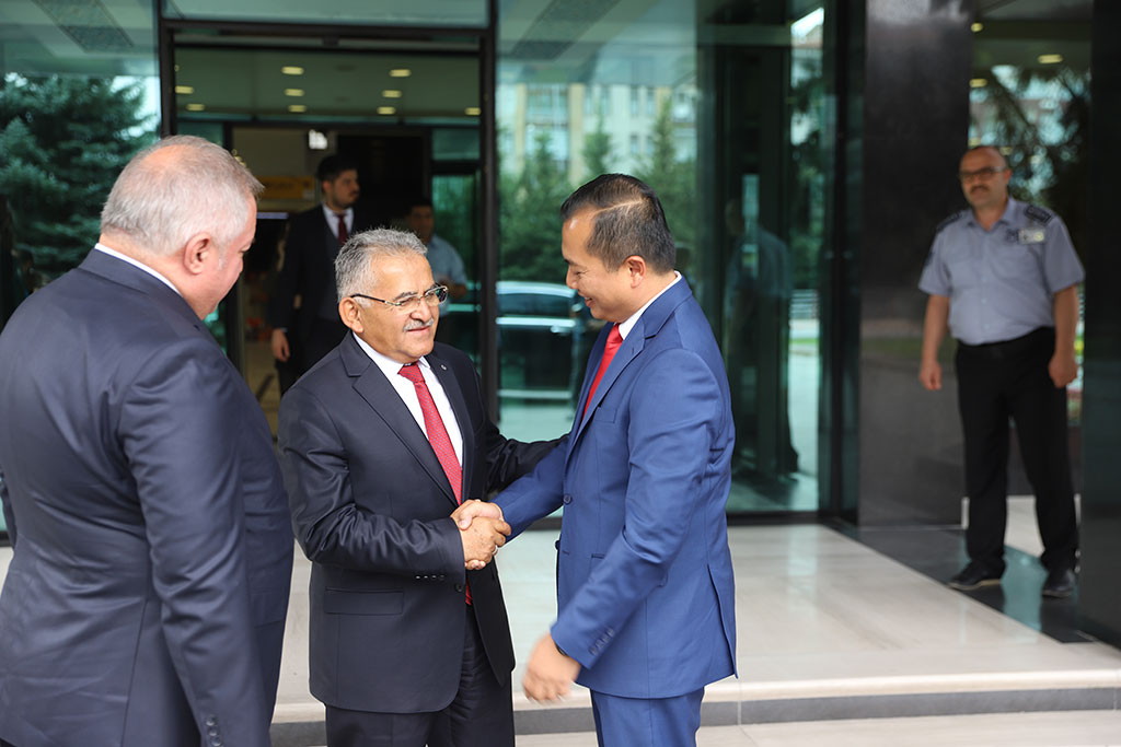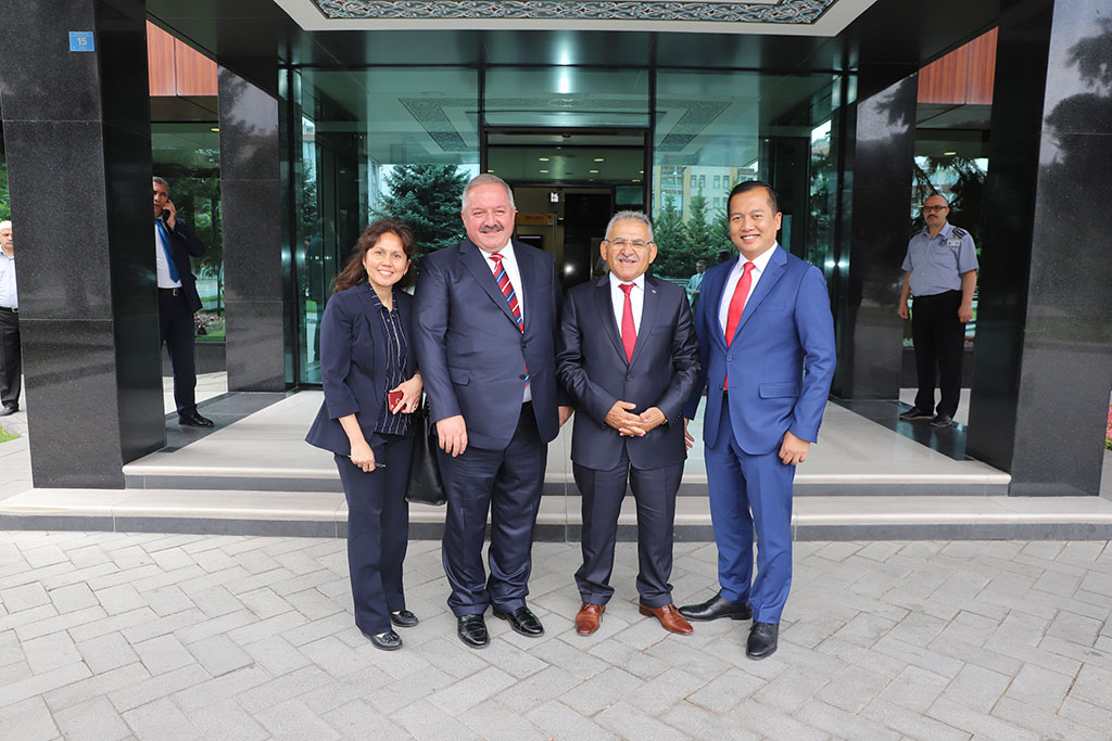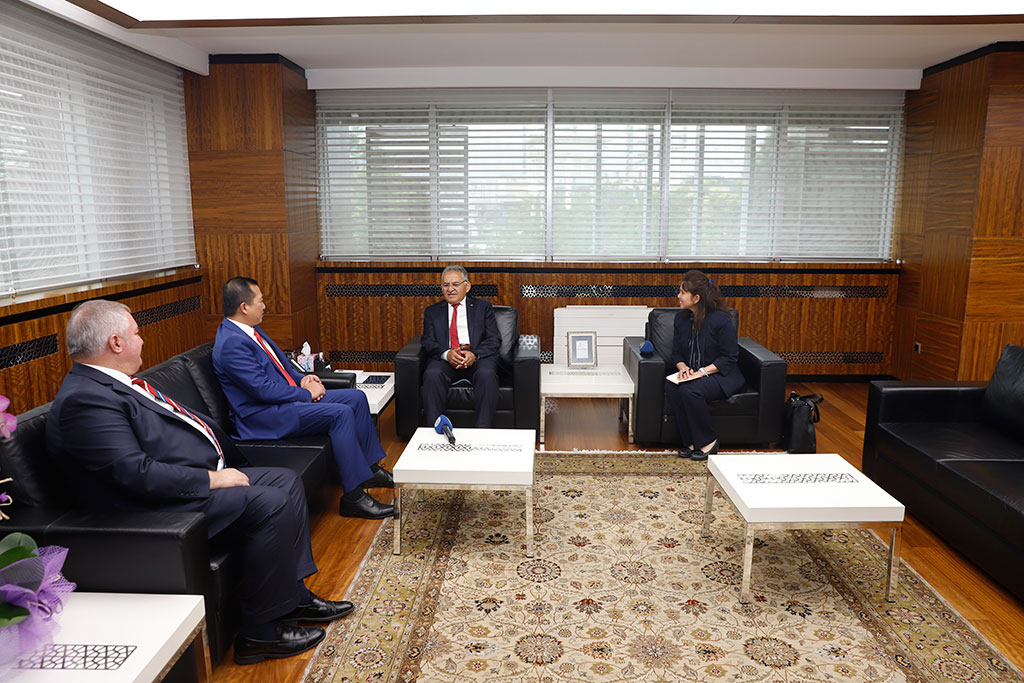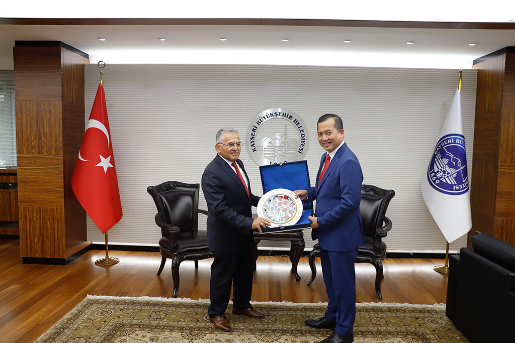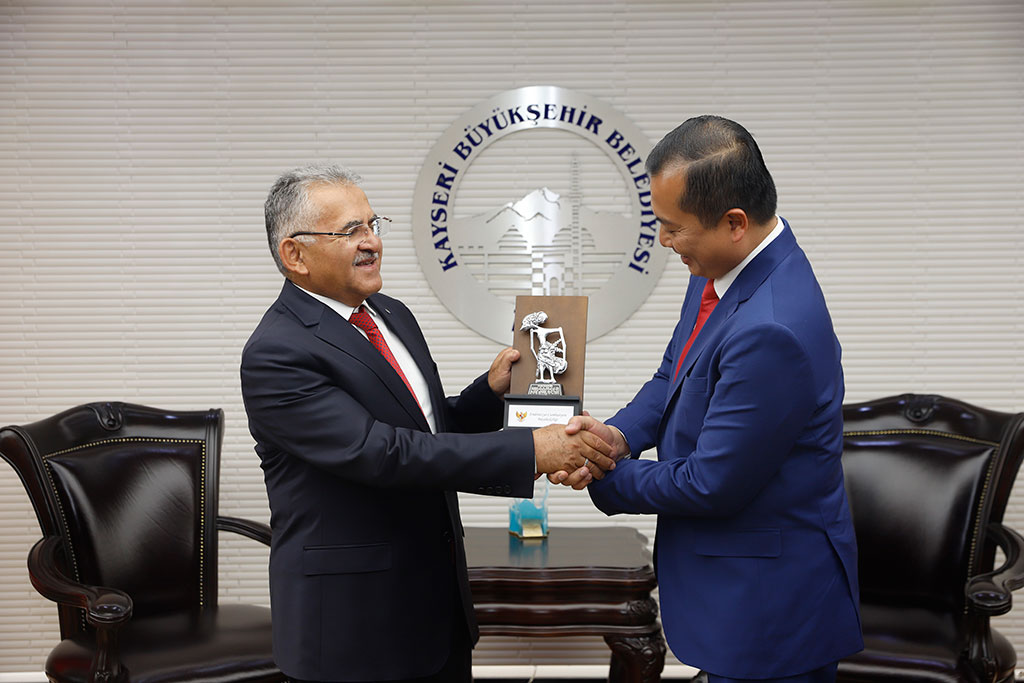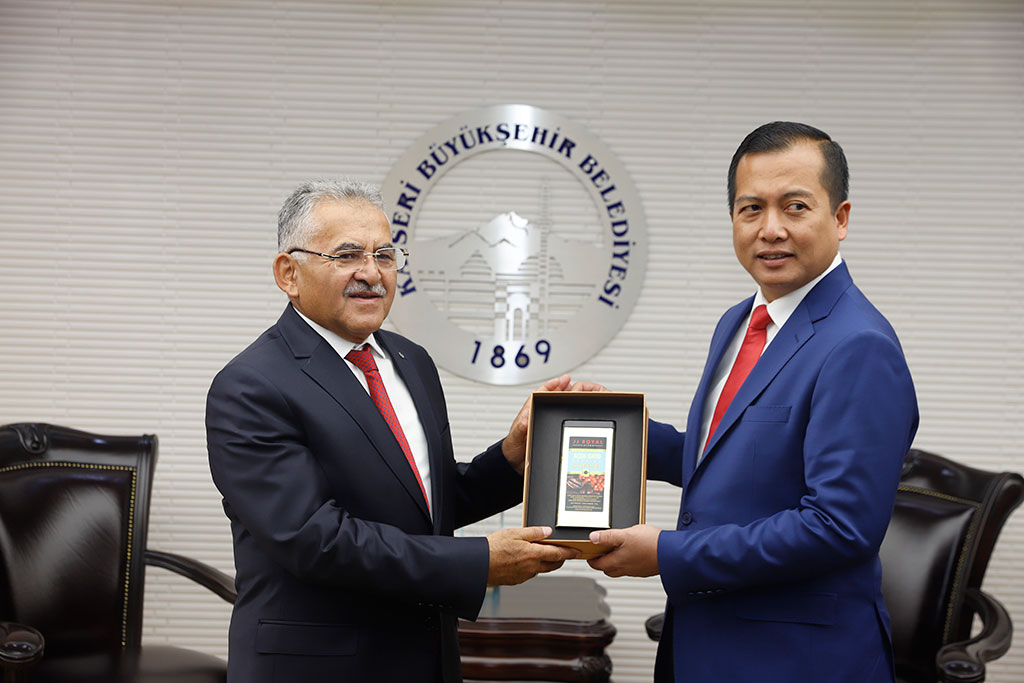 Endonezya’nın Ankara Büyükelçisi Lalu Muhammed Iqbal, Büyükşehir Belediye Başkanı Dr. Memduh Büyükkılıç’ı ziyaret etti. Endonezya’yı çalışkan, gayretli ve dost bir ülke olarak gördüklerini ifade eden Başkan Büyükkılıç, iki ülke arasındaki ilişkilerin geliştirilmesi gerektiğini belirtti ve Kayseri’nin yatırımcı için en güvenilir liman olduğunu söyledi. Büyükşehir Belediye Başkanı Dr. Memduh Büyükkılıç, 1,5 ay önce Endonezya’nın Ankara Büyükelçiliğine atanan ve ilk ziyaretini Kayseri’ye yapan Lalu Muhammed Iqbal’i Büyükşehir Belediyesi Başkanlık Girişinde karşıladı. Ziyarete Kayseri Organize Sanayi Bölgesi Yönetim Kurulu Başkanı Tahir Nursaçan da katıldı. Ziyarette Endonezya’nın Türkiye için dost bir ülke olduğunu ifade eden Başkan Büyükkılıç, “Endonezya’dan söz edilince içimizi bir sıcaklık kaplar. Sizleri; çalışkan, gayretli ve dost bir ülkenin insanları olarak biliriz” dedi. Konuşmasında Kayseri ile ilgili de bilgiler veren Başkan Büyükkılıç, “Kayseri, yatırımcının en güvenli liman olarak tercih edeceği bir şehir. 52 ülkeye 3 saat gibi kısa sürede ulaşılan bir konumda olduğumuz için yatırımcı açısından çok cazip. Özellikle Uzakdoğu’dan yatırımcılar için önem arz etmekte, bu yüzden de sık sık ziyaretimize gelen dostlar görmekteyiz. Özellikle Serbest Bölge ile Avrupa’ya çok rahat ihracat yapılabilir. Ülkemiz ve özelde de Kayseri’miz çeşitli medeniyetlere ev sahipliği yapmıştır. Kayseri, 6 bin yıllık tarihe sahip, tarihi İpek Yolu’nun üzerinde bir şehir. Çevresindeki illerle birlikte büyük bir nüfusa hitap etmektedir. Ulaşımı kolay olduğu için de tercih sebebi. Erciyes dağı gibi uluslararası kayak merkezinin olduğu bir değerimiz var. Bunun yanında Kapadokya ile kültür turizmi, balon turizmi, gastronomi turizmi, doğa turizmi, yayla turizmi ve sağlık turizmi de yapılabilmektedir” diye konuştu. Konuk Büyükelçi, Muhammed Iqbal de Kayseri’de ve Büyükşehir Belediyesi’nde gösterilen sıcak ilgi nedeniyle teşekkür etti. Ziyarette ayrıca karşılıklı hediyeler takdim edildi.