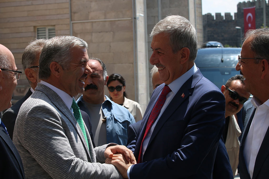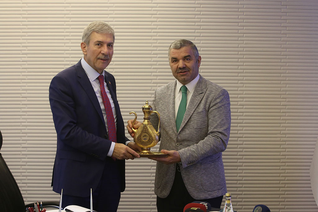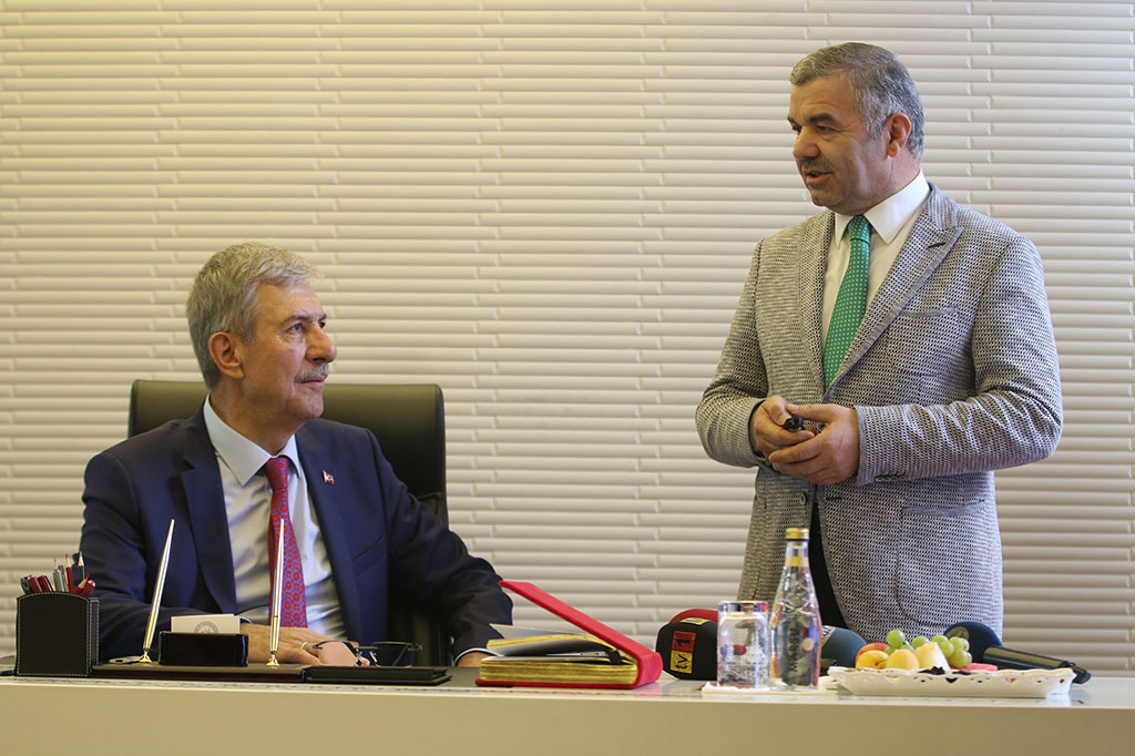 Sağlık Bakanı Ahmet Demircan, Çevre ve Şehircilik Bakanı Mehmet Özhaseki ile birlikte Büyükşehir Belediyesi’ni ziyaret etti. Ziyarette Büyükşehir Belediye Başkanı Mustafa Çelik, Bakan Demircan’a Kayseri ile ilgili detaylı bilgiler vererek şehrin doğusundaki yoğun nüfustan bahsetti ve bu bölgeye yeni bir hastane yapılması gerektiğini dile getirdi. Bakan Demircan, projenin güzel planlanmış olduğunu belirtti ve onay verdi. Büyükşehir Belediye Başkanı Mustafa Çelik, Sağlık Bakanı Ahmet Demircan ile Çevre ve Şehircilik Bakanı Mehmet Özhaseki’yi belediyenin başkanlık girişinde karşıladı. Ziyarete Bakan Demircan ve Bakan Özhaseki’nin yanı sıra Vali Süleyman Kamçı, Ekonomi Eski Bakanı ve AK Parti Grup Başkan Vekili Mustafa Elitaş, Enerji ve Tabi Kaynaklar Eski Bakanı Taner Yıldız, Kayseri Milletvekilleri İsmail Tamer, İsmail Emrah Karayel ve Sami Dedeoğlu, AK Parti İl Başkanı Hüseyin Cahit Özden ve ilçe belediye başkanları da katıldı. Büyükşehir Belediye Başkanı Mustafa Çelik, ziyarette Sağlık Bakanı Demircan’a Kayseri hakkında genel bilgiler vererek Kayseri ‘nin birçok medeniyete ev sahipliği yapmış bir şehir olduğunu söyledi. Başkan Çelik, Kayseri’deki planlı gelişme kültüründen de bahsetti. Sağlık Bakanı Ahmet Demircan da kendisine gösterilen yakınlık ve alakadan duyduğu memnuniyeti dile getirdi. Kayseri Anadolu’nun ortasında medeniyetlere ev sahipliği yapmış bir şehir olduğunu ifade ederek, Anadolu coğrafyasının önemini vurgulayan Bakan Demircan, “Bu coğrafyanın bir özelliği de şu: Bu coğrafya zayıf devlet yaşatmaz. Bu coğrafyada varlığımızı sürdürmek için güçlü olmak zorundayız. Hem bu coğrafyanın gerektirdiği güçlülüğü elde etmek hem de insanın vicdanı olmayı gerektiren tavır tutumu göstermek için daha fazla çalışmalıyız. Bakın Avrupa 100-200 bin göçmen karşısında panikledi, telaşa kapıldı ve insanlıkla bağdaşmayan uygulamalar içine girdi; ama biz 3,5 milyon sığınmacıyı, bölge insanını bağrımıza bastık ve onlarla birlikte yaşıyoruz. Böylelikle büyük bir medeniyetin gereğini yapıyoruz. O yüzden bu coğrafyada yaşamak için daha fazla çalışmak, daha fazla üretmek zorundayız. AK Parti iktidarı ve Recep Tayyip Erdoğan liderliğinde bunu hayata geçirme sürecini milletimize yaşattık. Bundan sonra da devam edeceğiz. İnanıyorum ki daha güzel günler bizi bekliyor” dedi. Ziyarette daha sonra Büyükşehir Belediye Başkanı Mustafa Çelik, Kayseri’nin sağlık haritasını çıkardı ve bununla ilgili bilgi verdi. Kayseri’nin bölgesindeki geniş bir nüfusun cazibe ve sağlık merkezi olduğunu ifade eden Başkan Çelik, yeni bölge hastanesine yapılacak ulaşımla ilgili çalışmalardan bahsetti. Yeni hastaneye ulaşımı sağlamak için geliş gidiş üçer şeritli Bekir Yıldız Bulvarı’nı açtıklarını dile getiren Başkan Çelik, raylı sistem için de Ulaştırma Bakanlığı’ndan söz aldıklarını söyledi. Konuşmasında şehrin doğusunda yoğunlaşan nüfustan da bahseden Başkan Mustafa Çelik, “Bu bölgede şu an 200 bin nüfus var. Nüfus ilerde daha da artacak. Bu bölgenin bir hastaneye ihtiyacı var. Beyazşehir-İldem-Mimsin-TOKİ’nin ortasında bir yer planlaması yaptık. Önümüzdeki birkaç yıl içinde bu hastaneyi yapmamız gerekiyor” diye konuştu. Sağlık Bakanı Ahmet Demircan da şehrin doğusuna hastane için güzel bir planlama yapılmış olduğunu belirtti ve yatırım programına almak için gerekli çalışmaları yapacaklarını ifade etti. Sağlık Bakanı Demircan ziyarette Büyükşehir Belediyesi’nin anı defterini de imzaladı. Ziyarette ayrıca Başkan Mustafa Çelik, Bakan Ahmet Demircan’a el yapımı bir ibrik hediye etti.