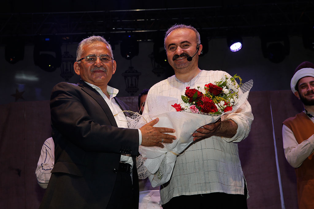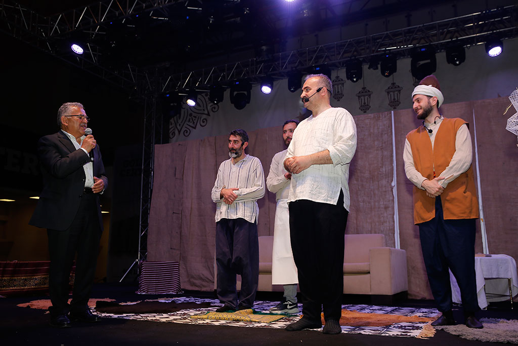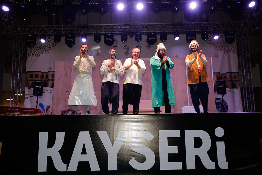 Kayseri Büyükşehir Belediye Başkanı Dr. Memduh Büyükkılıç, iki ayrı iftara katılıp, Argıncık’ta teravih namazını kıldıktan sonra Kayseri Dünya Ticaret Merkezi’ndeki Ramazan Etkinliklerine katıldı. Başkan Büyükkılıç, burada eşi Necmiye Büyükkılıç ile birlikte “Ziyafet Sofrası” adlı oyunu izledi. Kayseri Dünya Ticaret Merkezi’ndeki Ramazan coşkusuna her gün teravih namazının ardından başlayan etkinlikler de renk katıyor. Ramazan etkinliklerinin 15’inci gününde sahneye Tiyatro Külliyen oyuncuları çıktı ve “Ziyafet Sofrası” adlı oyunu sahneledi. Oyunda; Osman Doğan, Yunus Emre Obut, Fatih Akçin ve Taha Dinler rol aldı. Üsküdar’daki Hüdai Dergâhı’na yolu düşen iki sarhoşun karşılaştığı manevi ziyafetin anlatıldığı oyunu Büyükşehir Belediye Başkanı Memduh Büyükkılıç, eşi Necmiye Büyükkılıç ile birlikte izledi. Oyun sonrası sahneye çıkarak sanatçılara teşekkür eden Başkan Memduh Büyükkılıç, oyunda verilen mesajların tesirli olması temennisinde bulundu. Başkan Büyükkılıç, daha sonra vatandaşlarla hatıra fotoğrafları çektirdi.