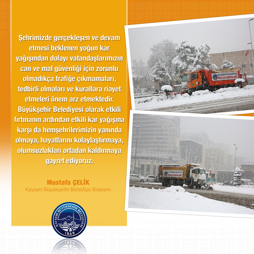 Gece başlayan ve gün boyunca devam eden yoğun kar yağışı ve tipi nedeniyle yaşanan olumsuzlukların giderilmesi için Büyükşehir Belediyesi ekipleri kesintisiz çalışıyor.