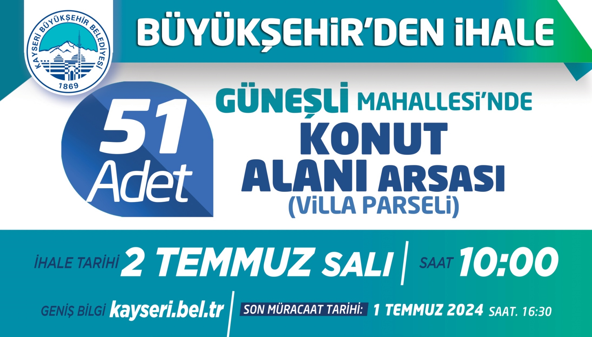 Mülkiyeti Kayseri Büyükşehir Belediyesi’ne ait olan Kocasinan ilçesi Güneşli Mahallesi’nde bulunan 38 adet konut arsası alanı, “Açık Teklif Usulü” ihale ile satışa çıkarılacak.